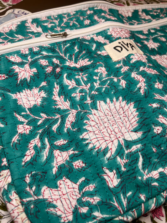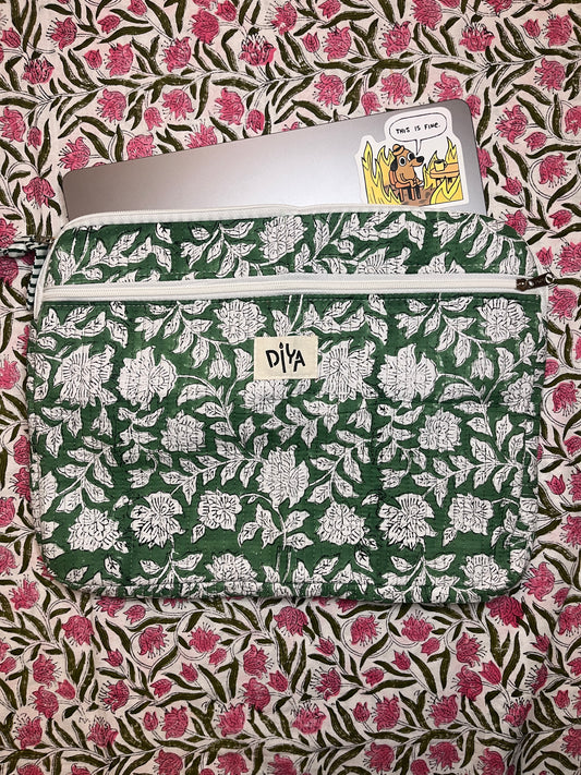 Carry your tech beautifully. Our hand block-printed cotton laptop sleeves blend everyday practicality with timeless design. Each fits up to an 18-inch laptop, includes an extra pocket for essentials, and is crafted from 100% cotton for a soft, sustainable finish.