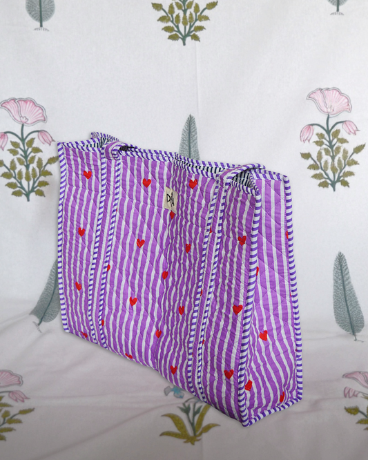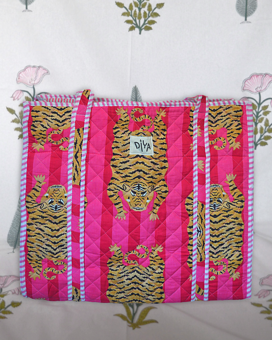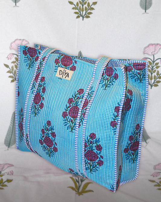 Discover Diya Dublin's Artisan Quilted Totes. These handcrafted block print bags are 18 inches wide and 15 Inches height, featuring a laptop pocket and water bottle holder. Perfect for daily use.