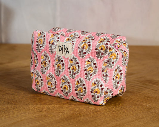 A spacious quilted wash bag made from 100% block-printed cotton. With a generous 11" × 5.5" × 6" size, it fits full-size toiletries and travel essentials with ease. Lightweight, durable, and perfect for home or travel.