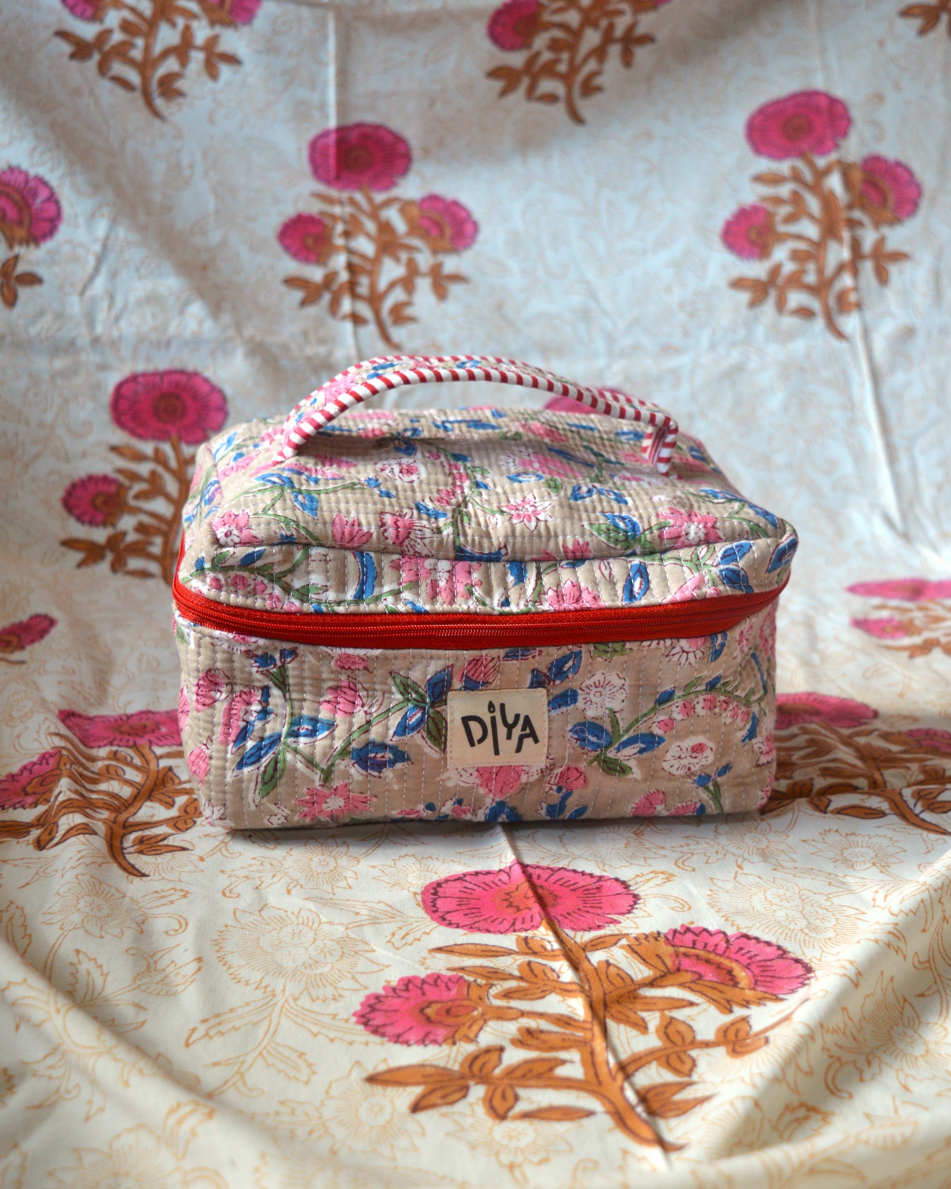 A soft beige and red floral pouch with plenty of room for your everyday essentials. Made from 100% cotton, with a waterproof lining, three interior pockets, and a sturdy carrying handle. Sized 22×16×12 cm, it keeps everything organised and easy to reach.