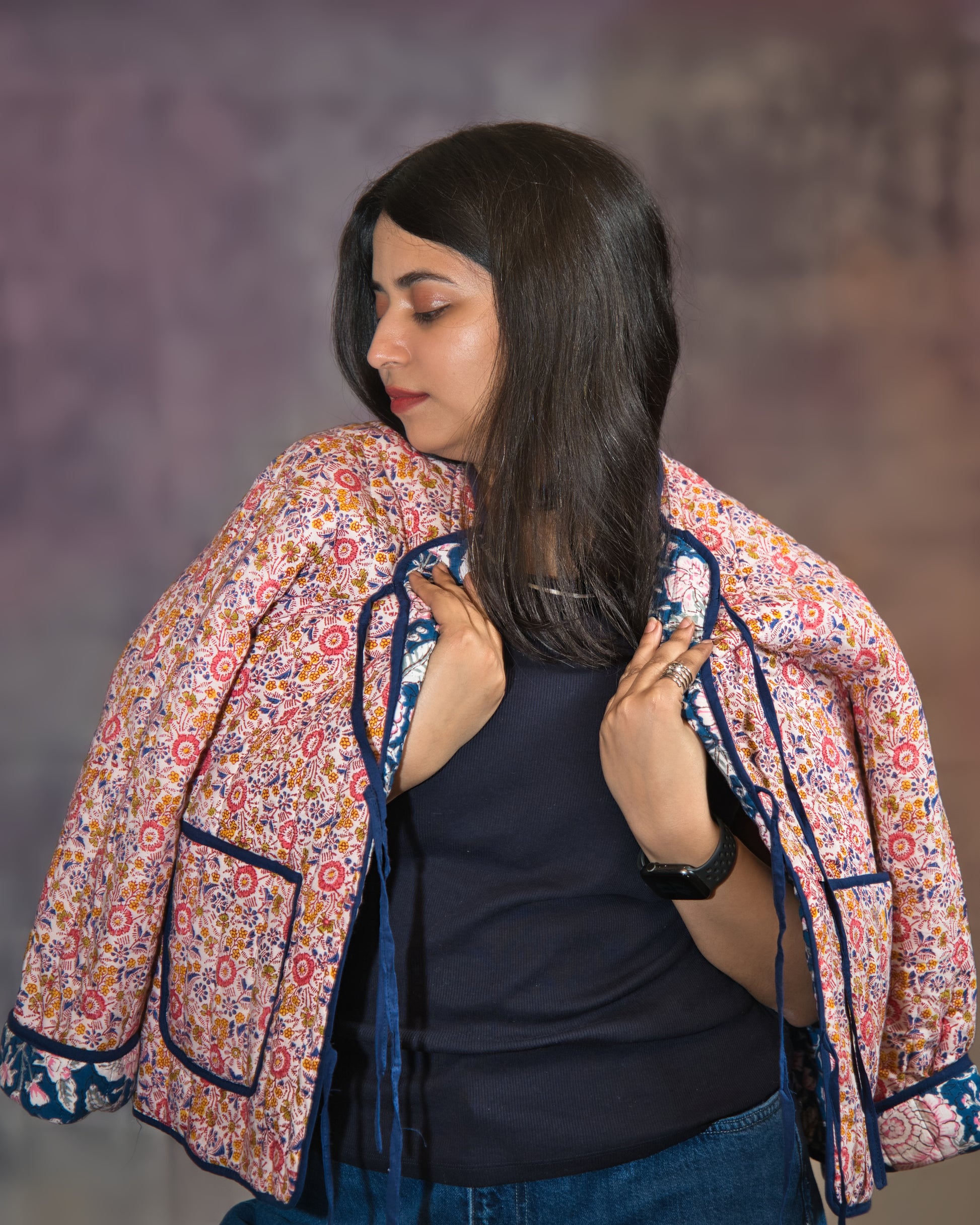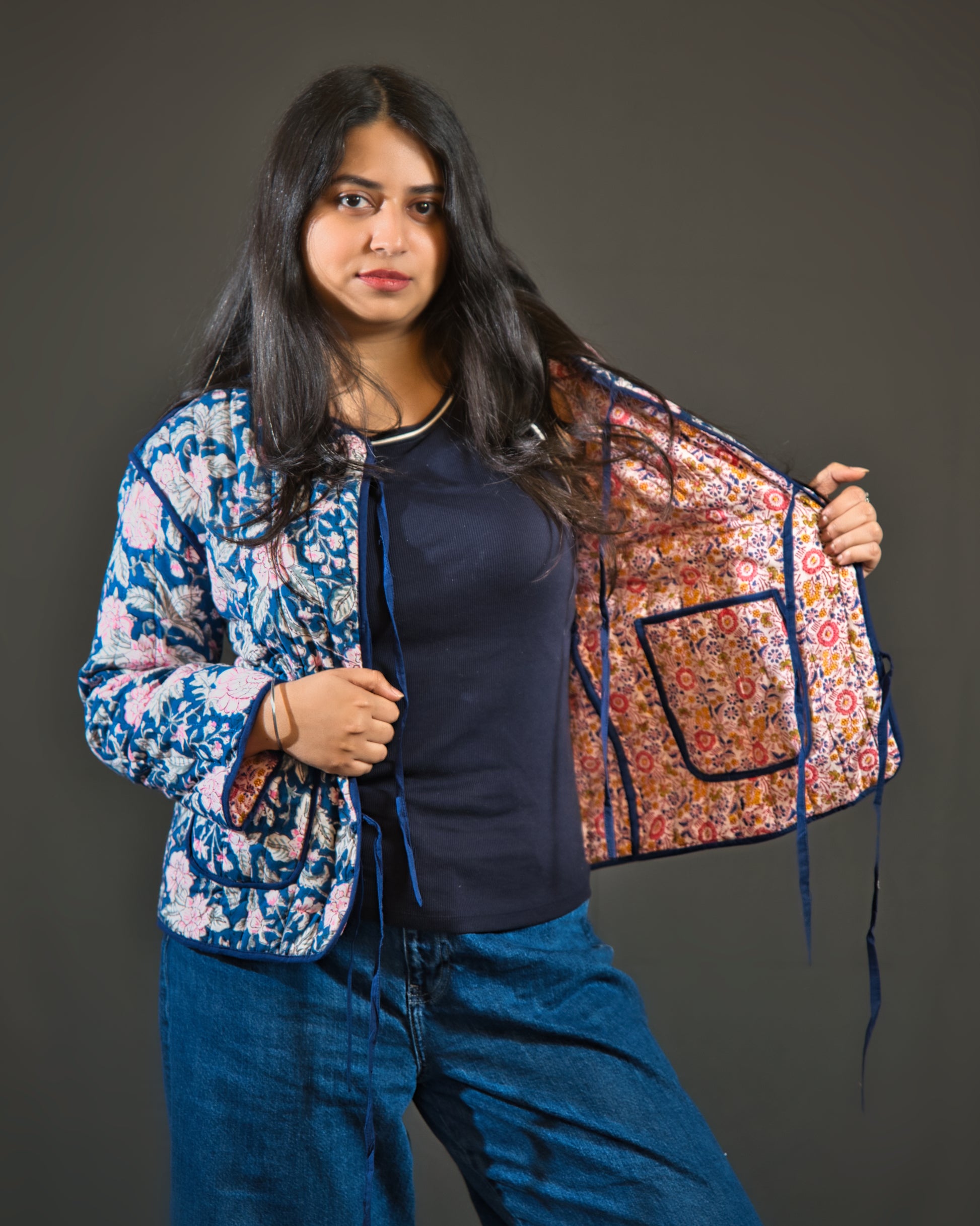 A playful mix of blue and pink, reversible for two fresh looks. Crafted in soft quilted cotton for comfort and charm. Our adjustable ribbon-tie design allows each jacket to comfortably fit across sizes — S–M, L–XL, and 2XL — offering an easy, flexible fit for different body shapes. Dry-clean only.