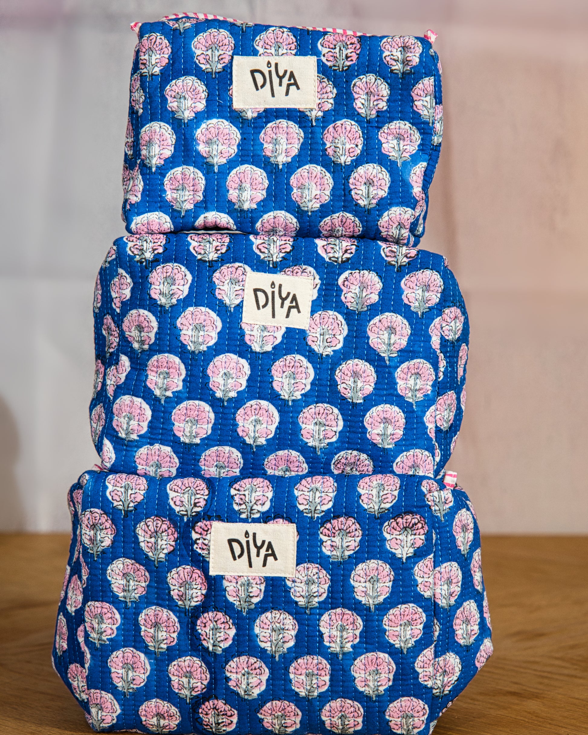 Fresh blue florals printed onto quilted cotton give this wash bag a bright, uplifting feel. The 9" × 4.4" × 5" size is ideal for organising toiletries or everyday items. Lightweight, soft, and easy to pop into any handbag or suitcase.
