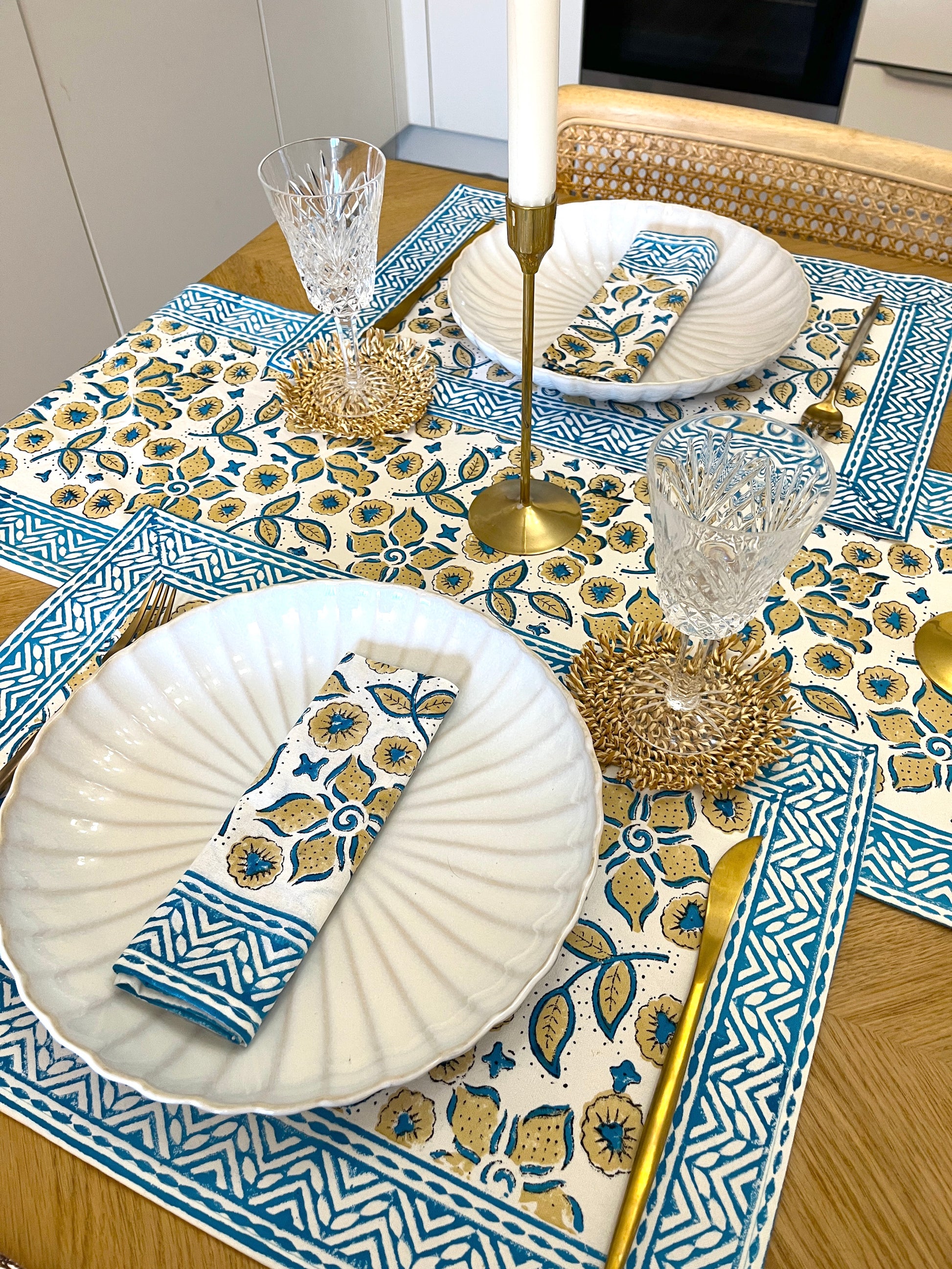 Classic blue florals on white cotton — fresh and graceful. Comes as a set of 2 napkins, each 40×40 cm, block-printed by hand. Hand wash in cold water.