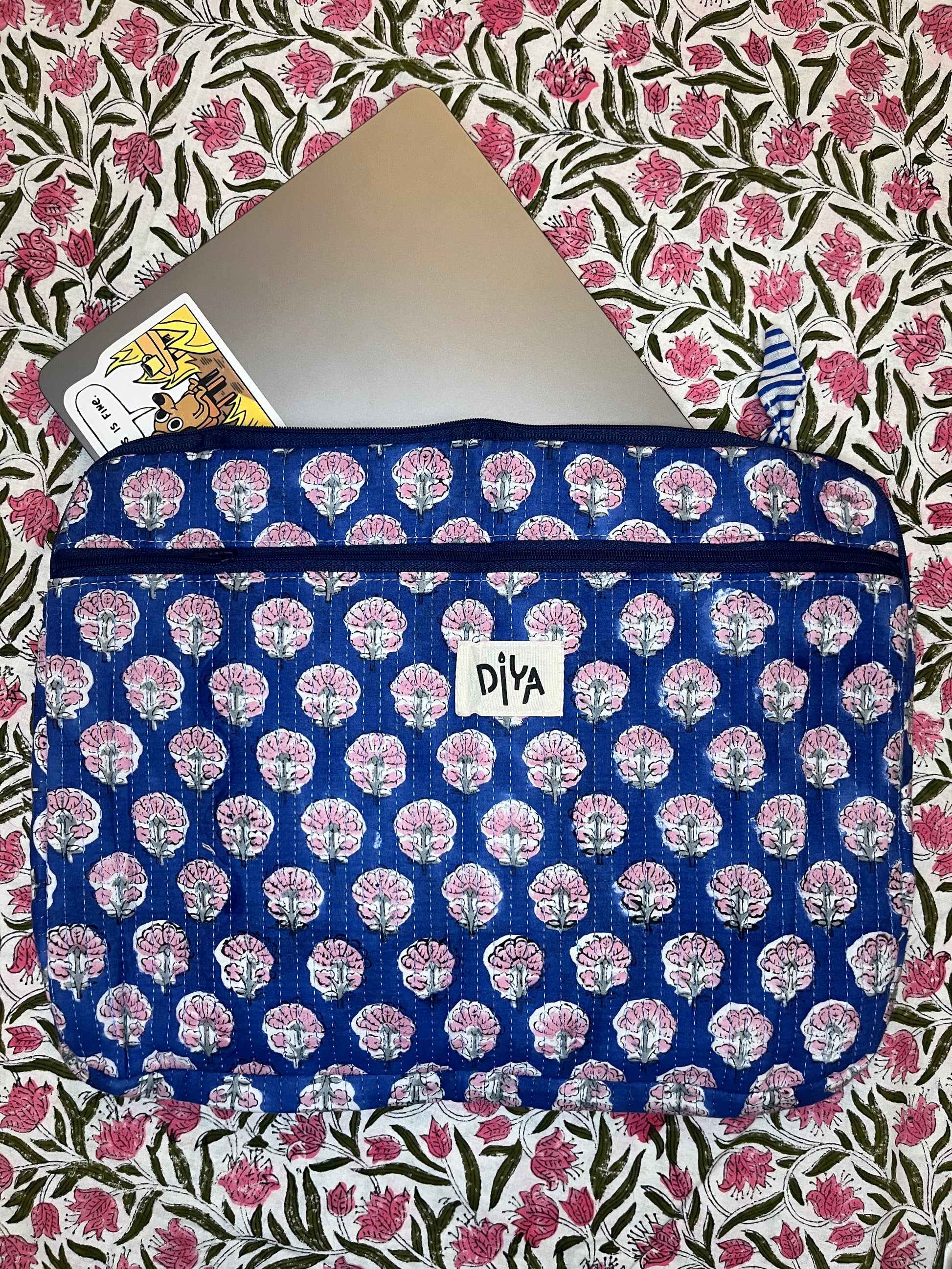 Cool blue floral motifs for a subtle yet stylish look. Crafted from hand block-printed cotton, fits up to 18-inch laptops, and features an extra pocket to keep your accessories close.