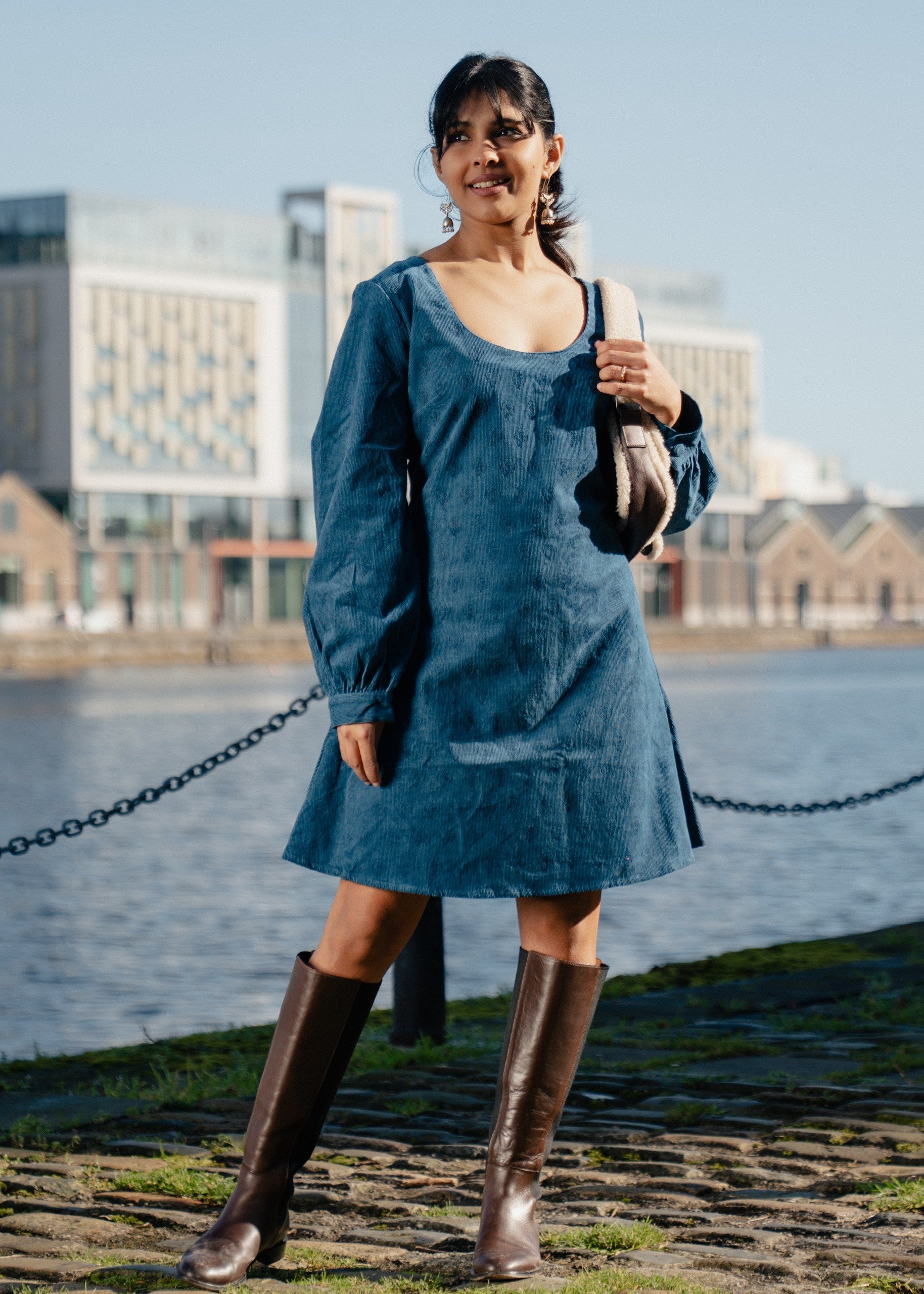 Effortless elegance in Lapis Blue Long Sleeve Dress. This full-sleeve corduroy dress is built to last and features our signature motifs, crafted in collaboration with local artisans.