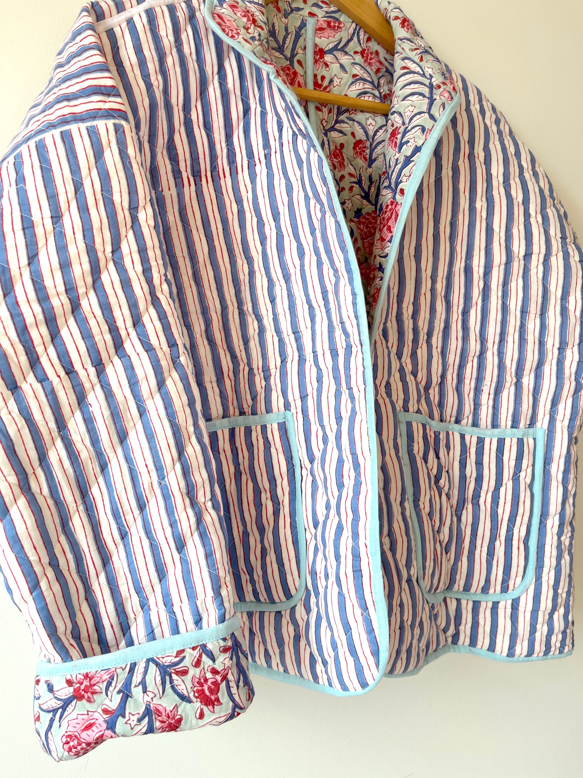 With playful pink florals on a blue base, this reversible quilted jacket adds charm to every outfit. Crafted by artisans using block printing, each jacket carries subtle differences that highlight its handmade nature. Best cared for with a gentle hand wash in cold water.