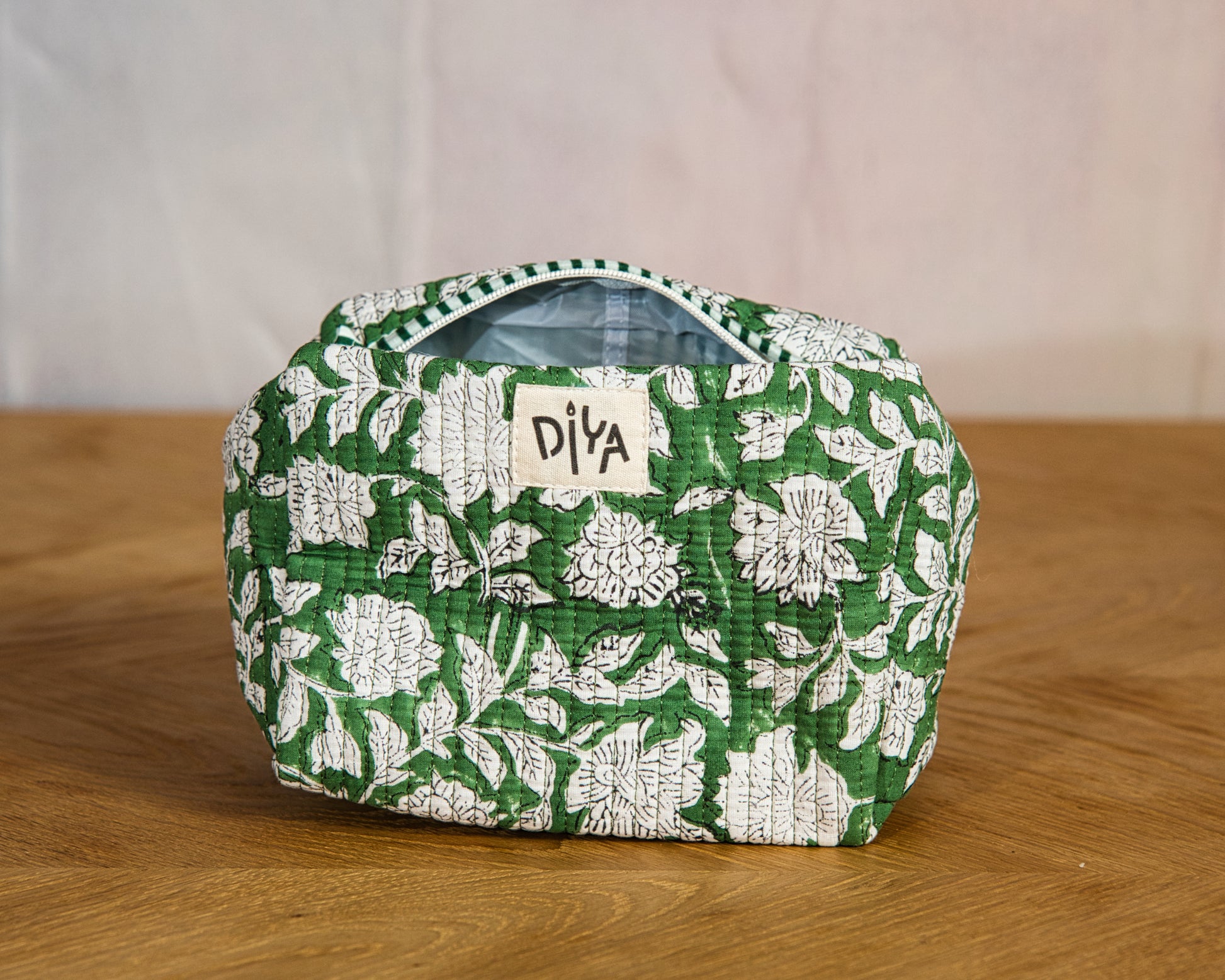 A deep green wash bag quilted in soft, breathable cotton with a unique block-printed pattern. Sized 7" × 3.5" × 4", it’s perfect for keeping toiletries or small essentials organised at home or on the go. Lightweight, durable, and easy to carry.
