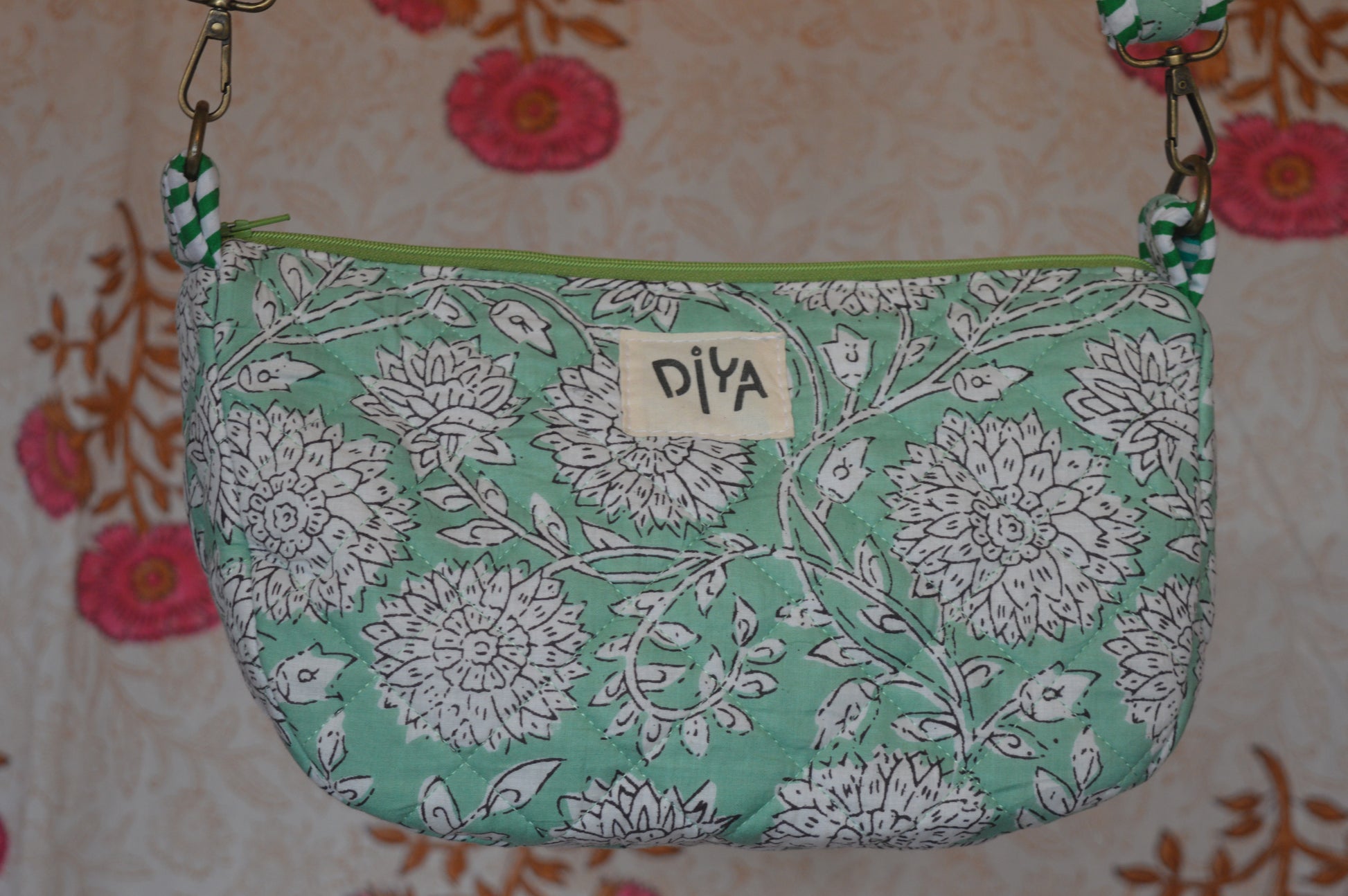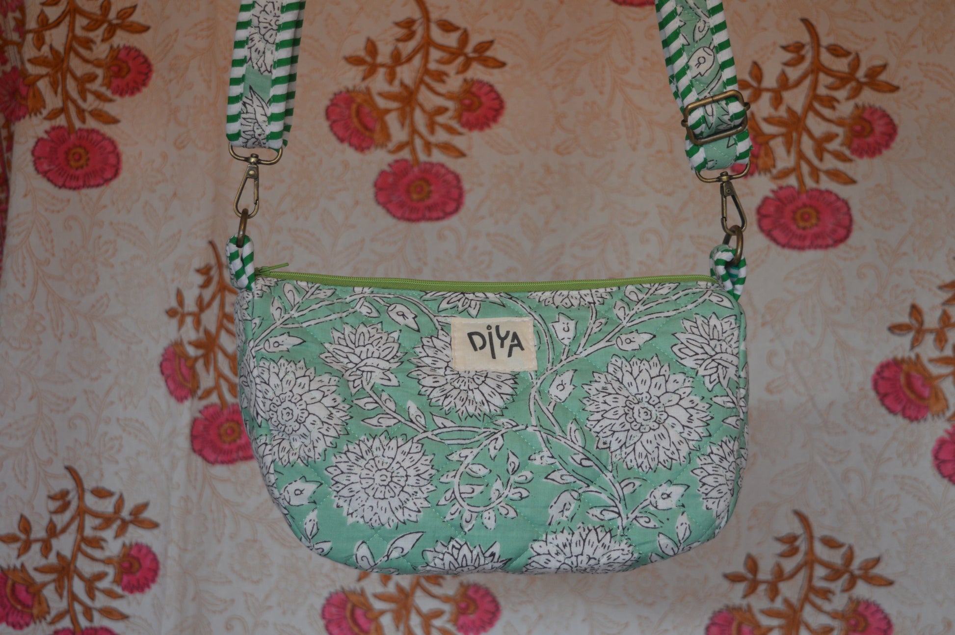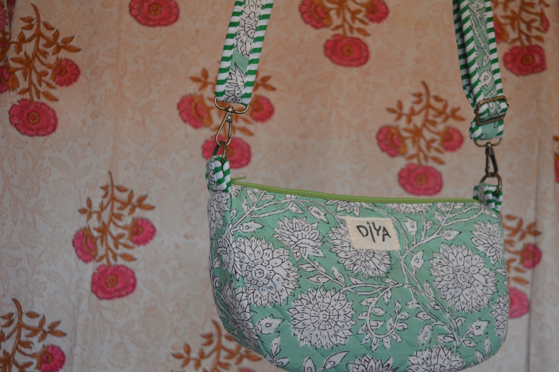 A fresh green base with soft white florals, this crossbody bag is lightweight and easy to carry. Made from block-printed cotton, it’s perfect for everyday use when you want hands-free comfort with a touch of colour.