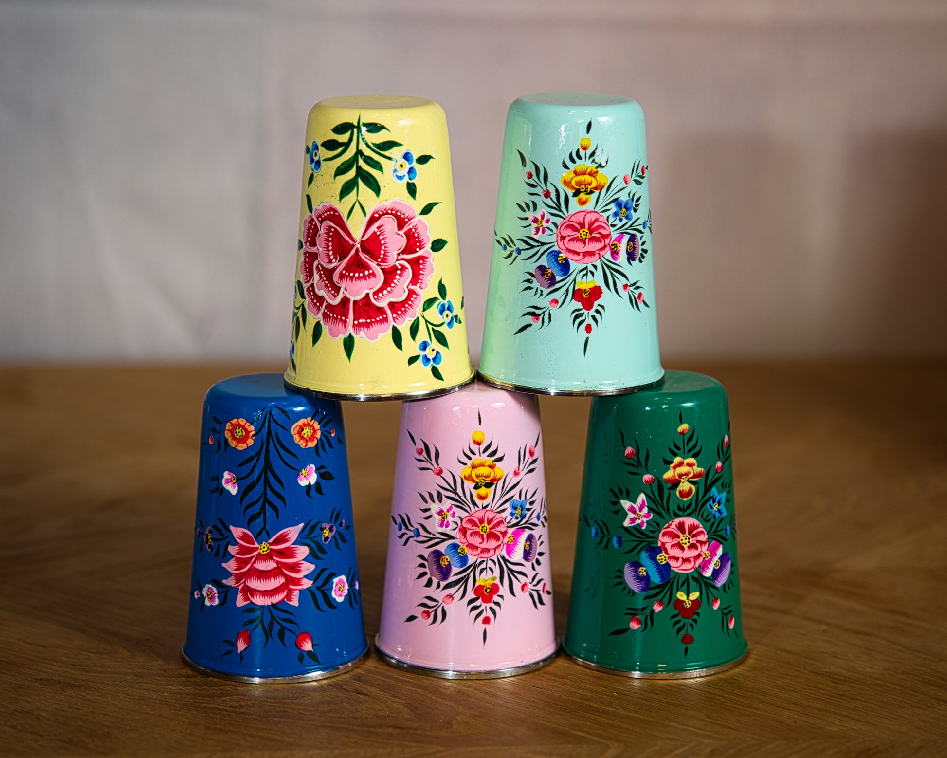 Hand-painted in a soft green finish, this enamel glass is light, sturdy, and easy to use. Hand wash only; avoid dishwasher.