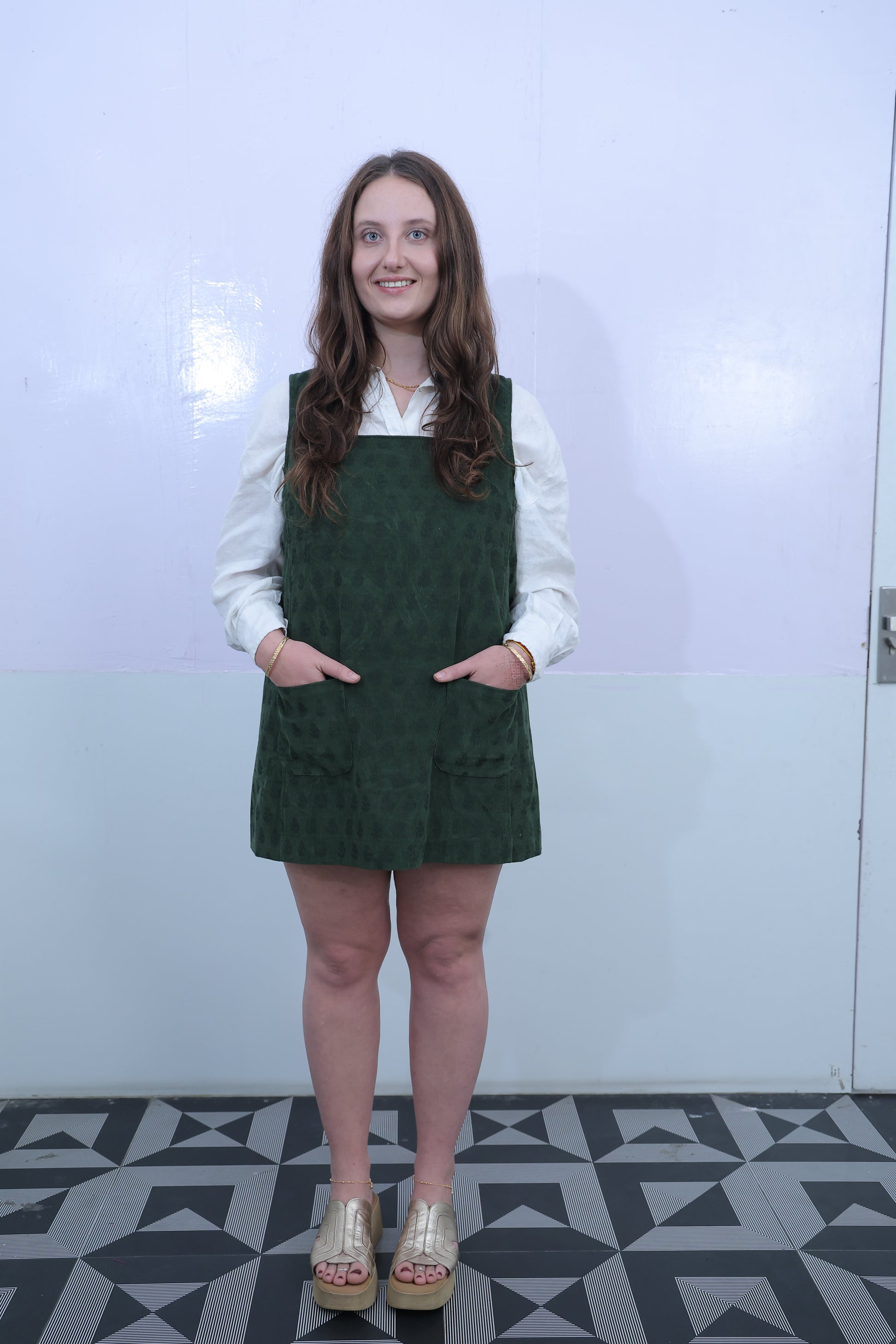 Simple, earthy, and refined. This sage green corduroy dress is a comfortable staple that combines a modern cut with traditional artisan prints.
