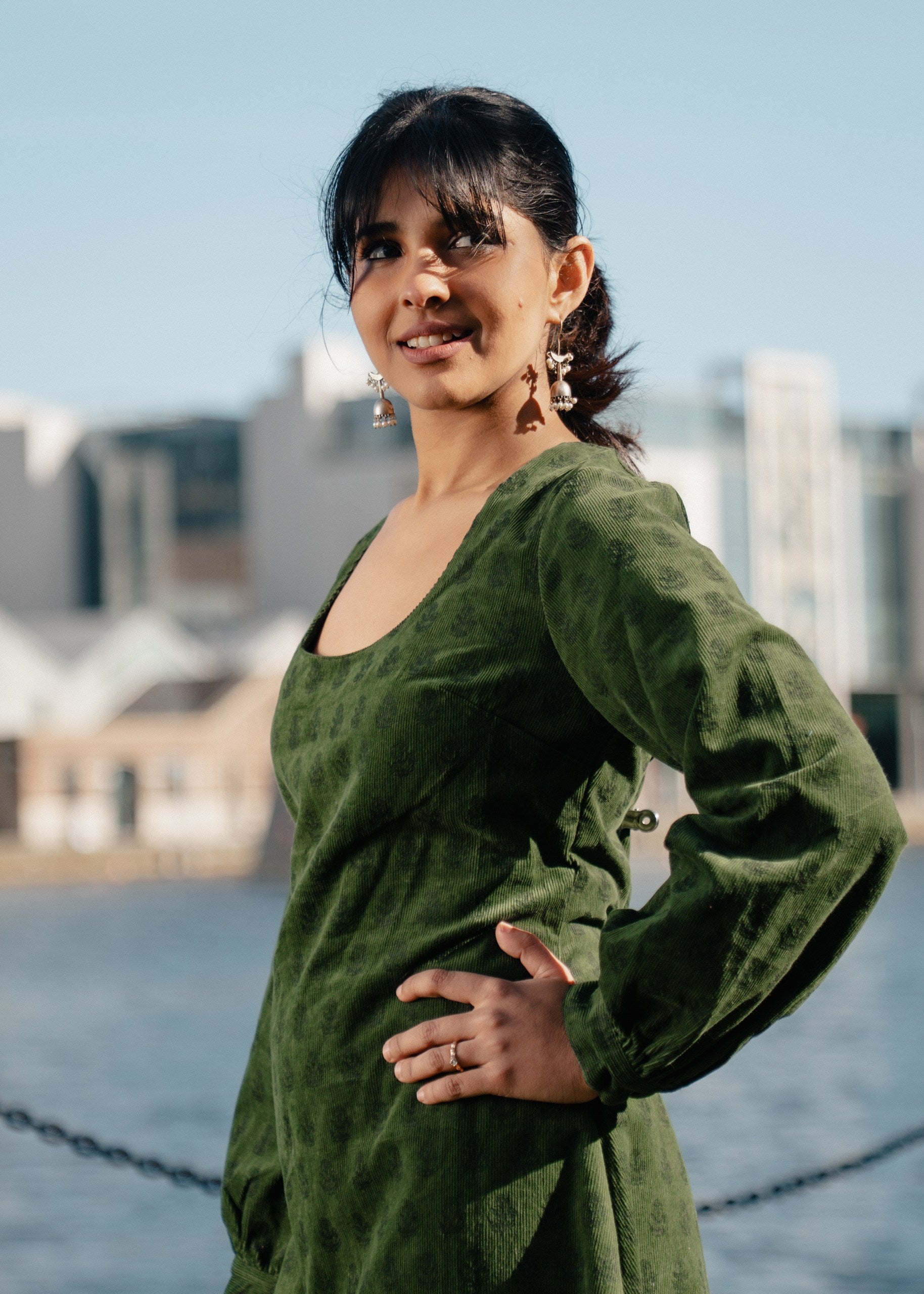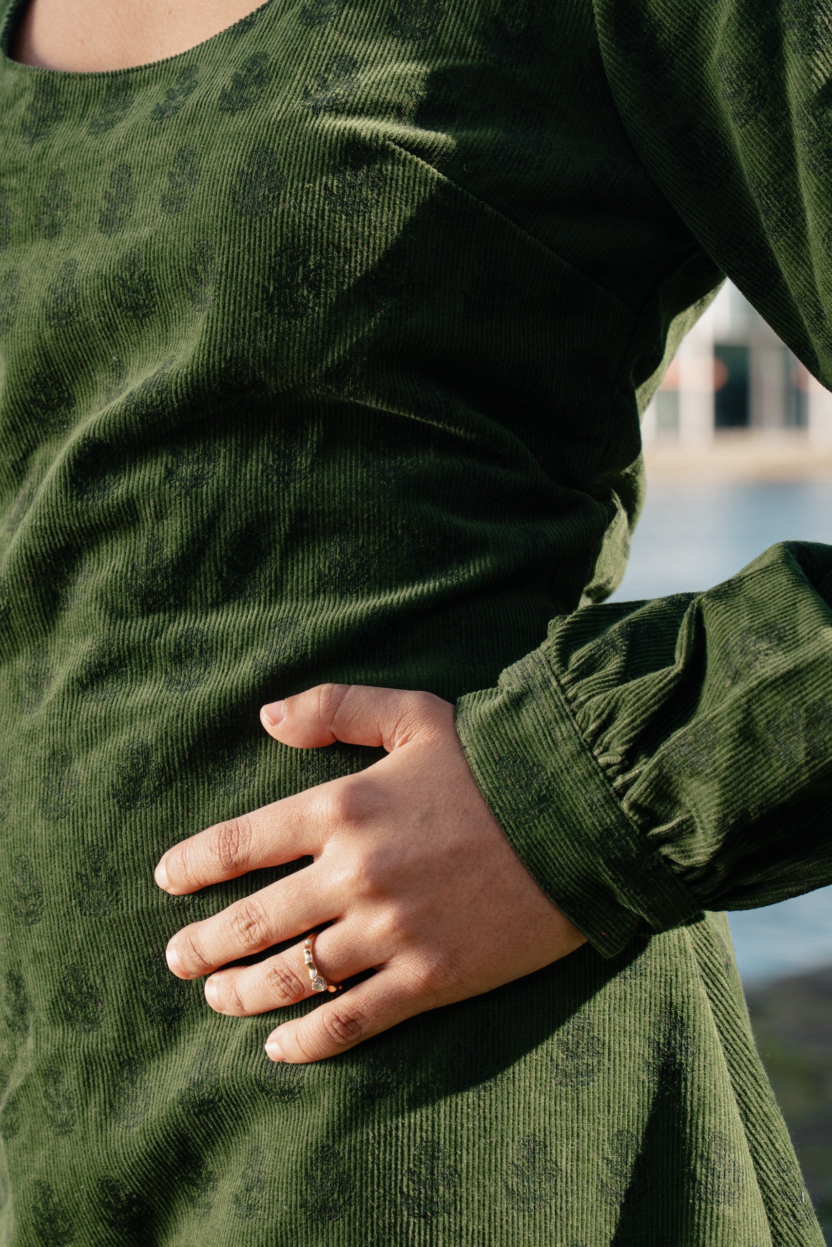A cozy classic for cooler days. This Forest Green Corduroy Full Sleeves dress combines soft corduroy with our own hand-designed motifs. It features elegant full sleeves and a comfortable fit, making it ideal for everyday wear.