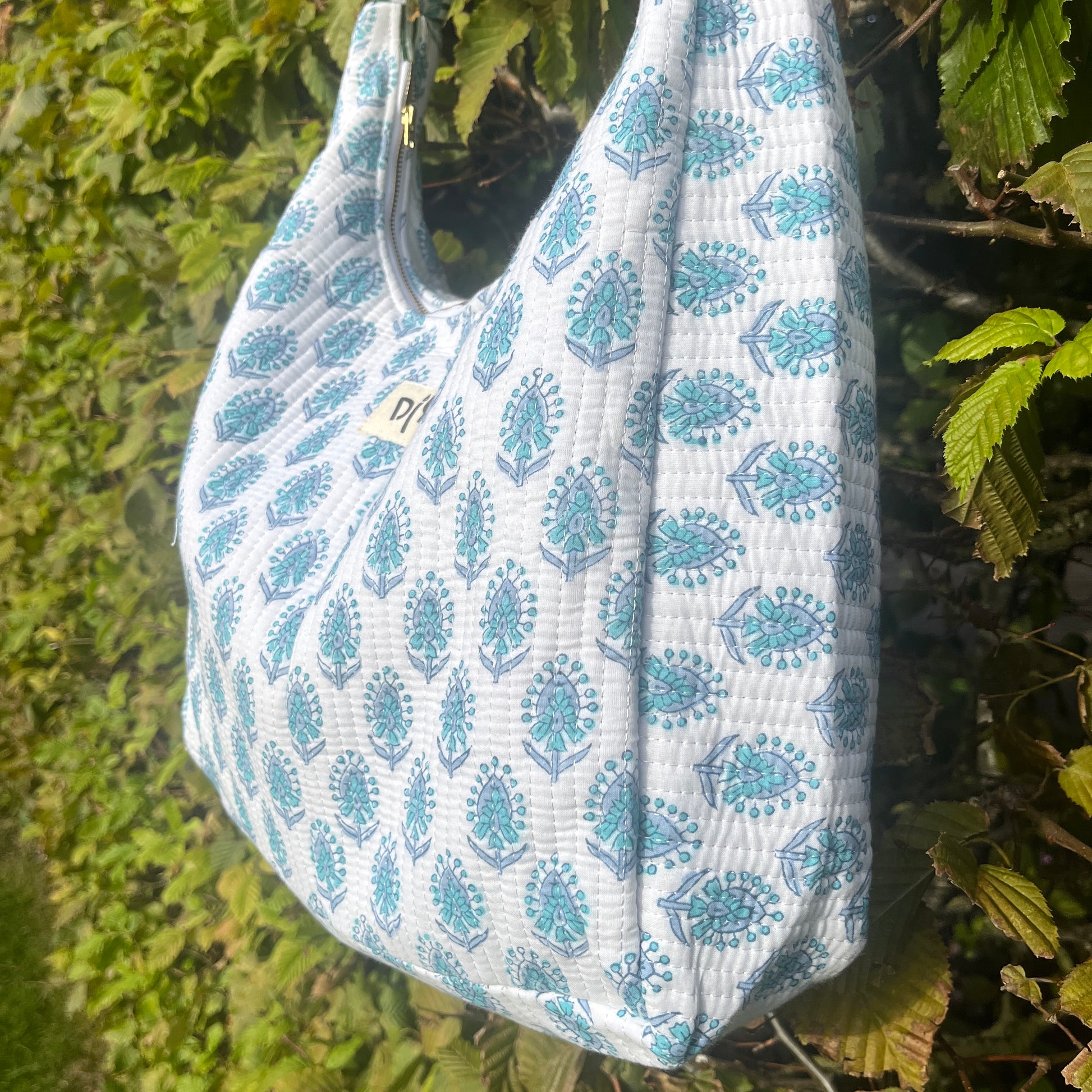Classic and versatile, this Jaipur-made quilted cotton shoulder bag combines crisp white with delicate blue florals. Spacious and lightweight, it’s artisan-crafted with block and screen prints, featuring a secure zip pocket for work or everyday carry.