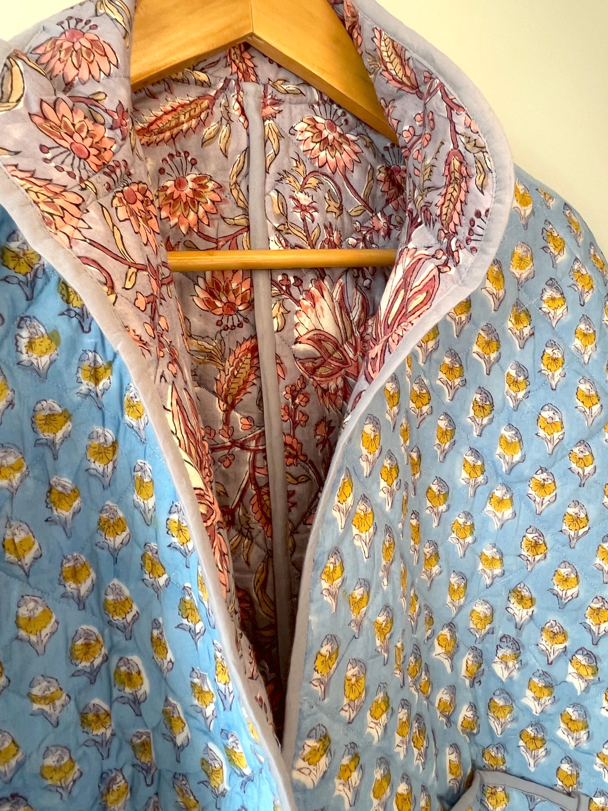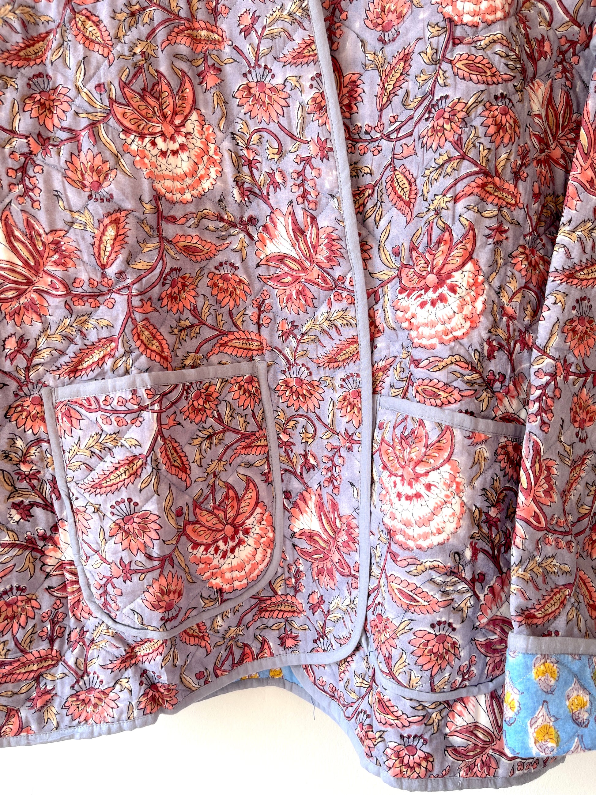 In soft grey with delicate blue florals, this reversible quilted jacket blends classic style with artisan detail. Each piece is handmade, and natural variations in the print make it truly one of a kind. Hand wash in cold water to keep it fresh season after season.
