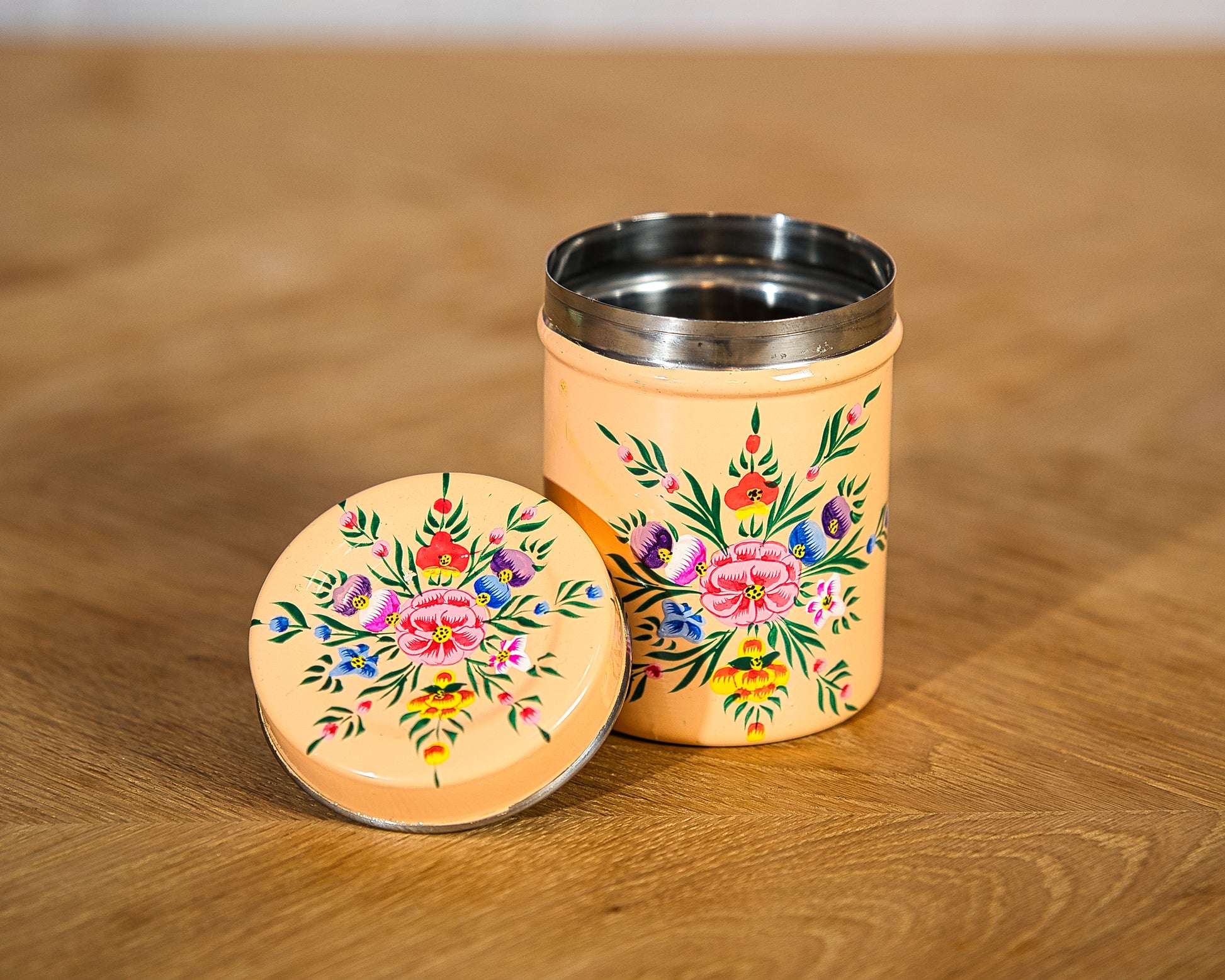A warm orange enamel tea box with a hand-painted finish. Great for organising tea or small kitchen items. Hand wash only.