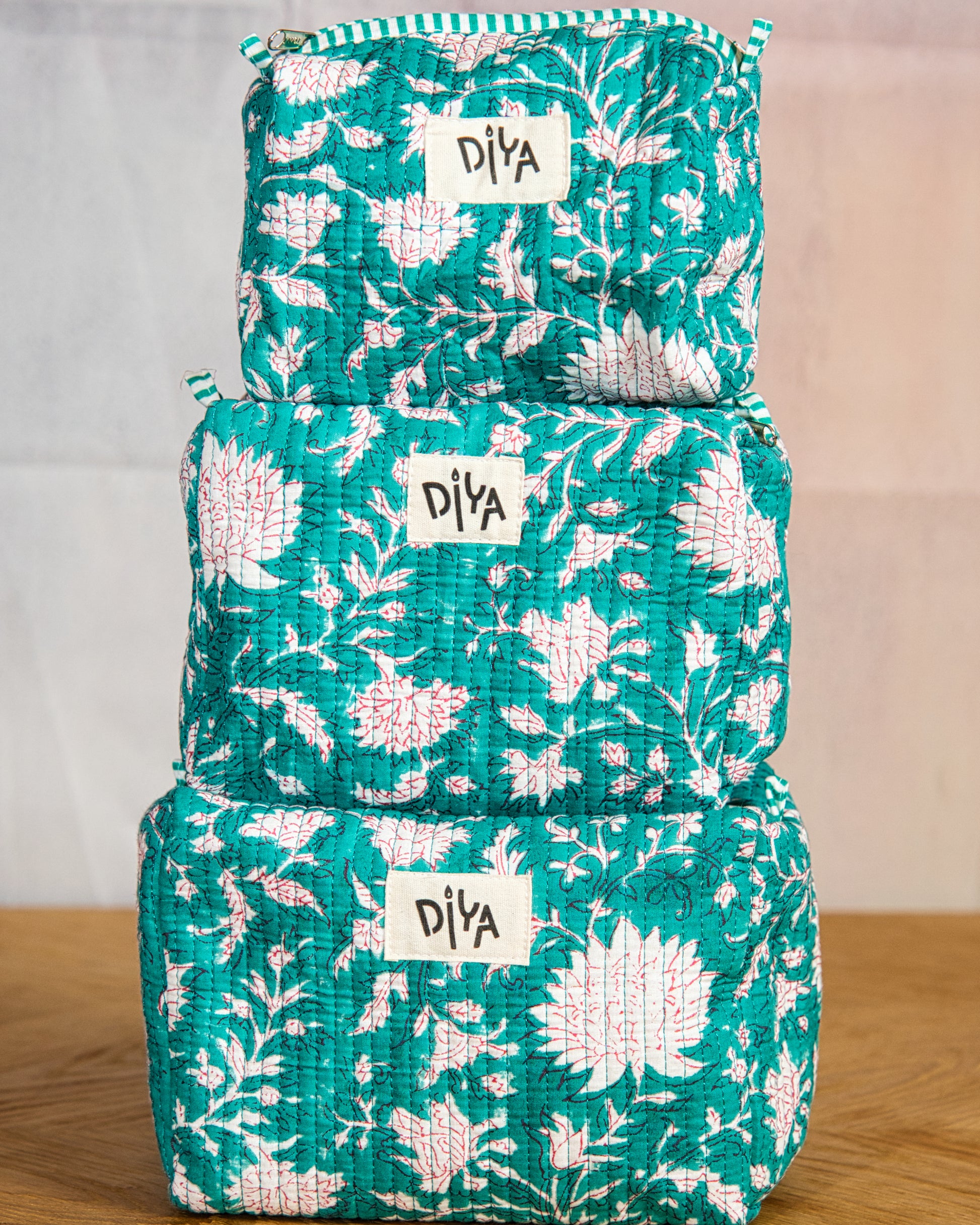 With its earthy olive green print, this small wash bag is both stylish and handy. Crafted from 100% cotton, quilted, and perfectly sized at 9" × 4.4" × 5", it keeps your essentials neatly tucked away whether at home or travelling.