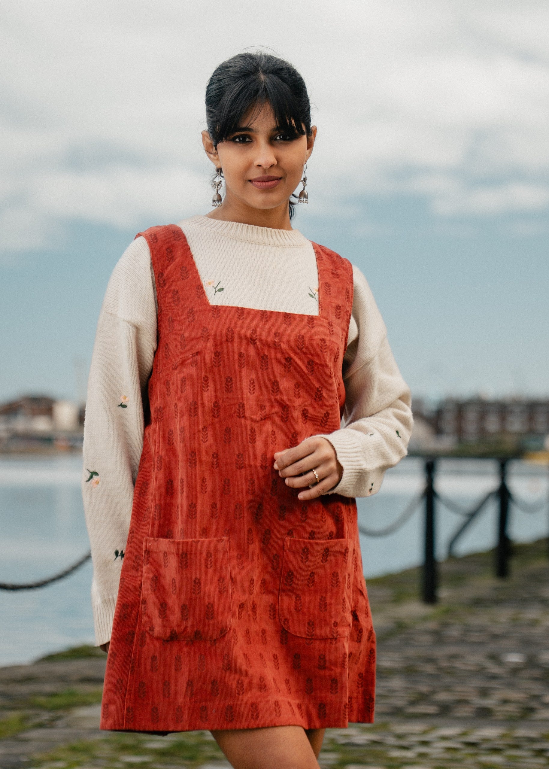Bold and timeless. Our Burnt Orange Cord Dress uses high-quality corduroy to create a structural yet comfortable look. Each motif is a nod to traditional craft, making it a true standout piece.
