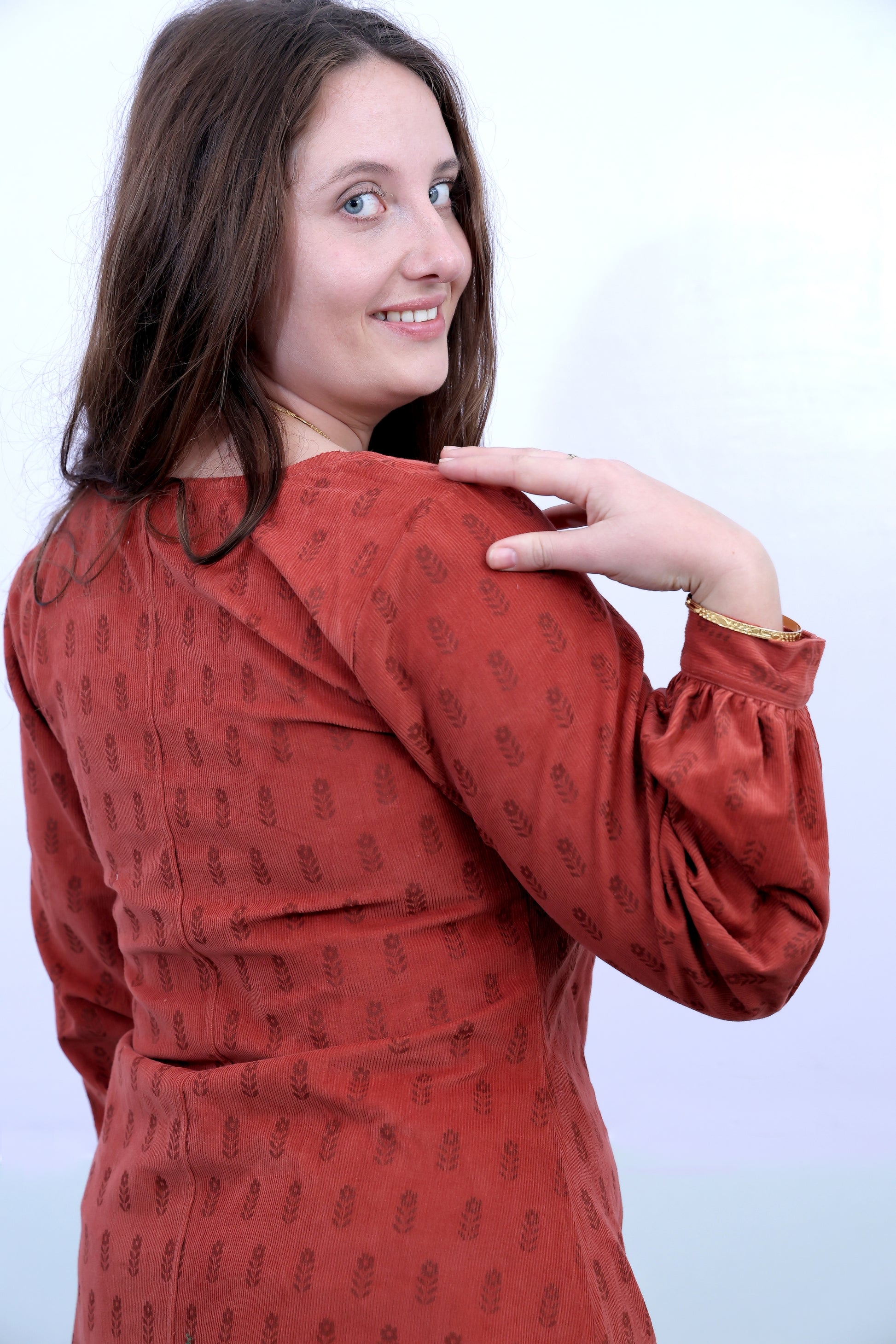 Brighten up your look with this burnt orange dress. Made from soft ribbed corduroy and detailed with artisan motifs, it is the perfect blend of warmth and color.
