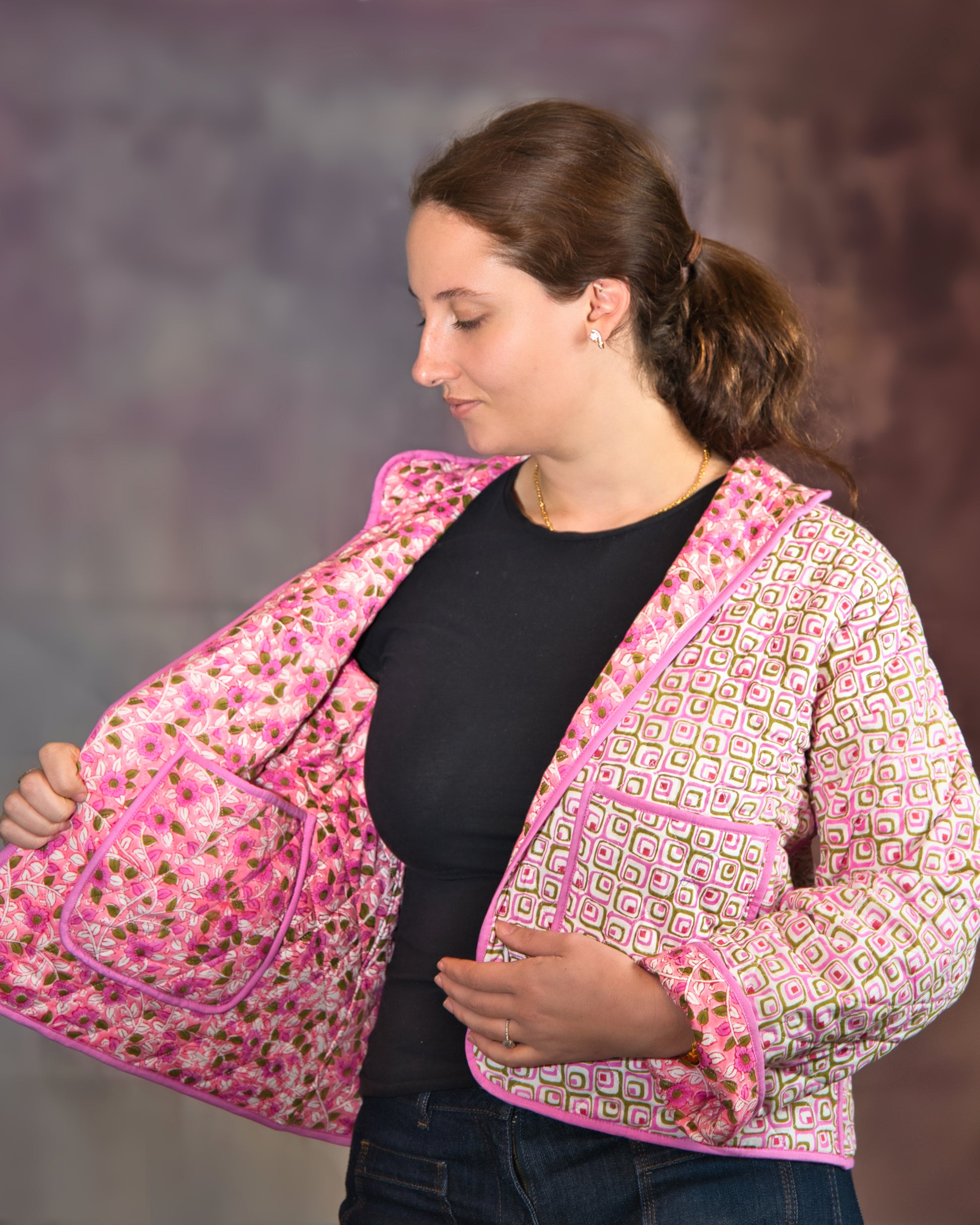 Soft, feminine, and handcrafted — this reversible pink jacket offers two elegant shades for effortless styling. Dry-clean only.