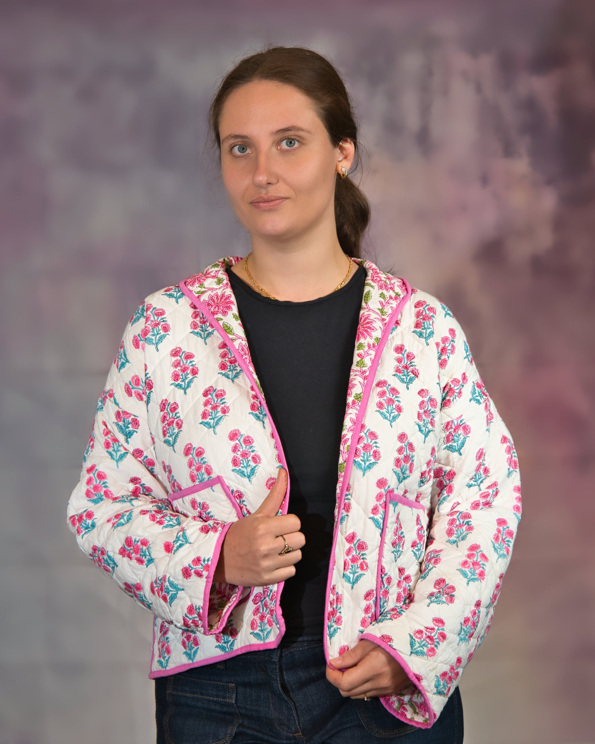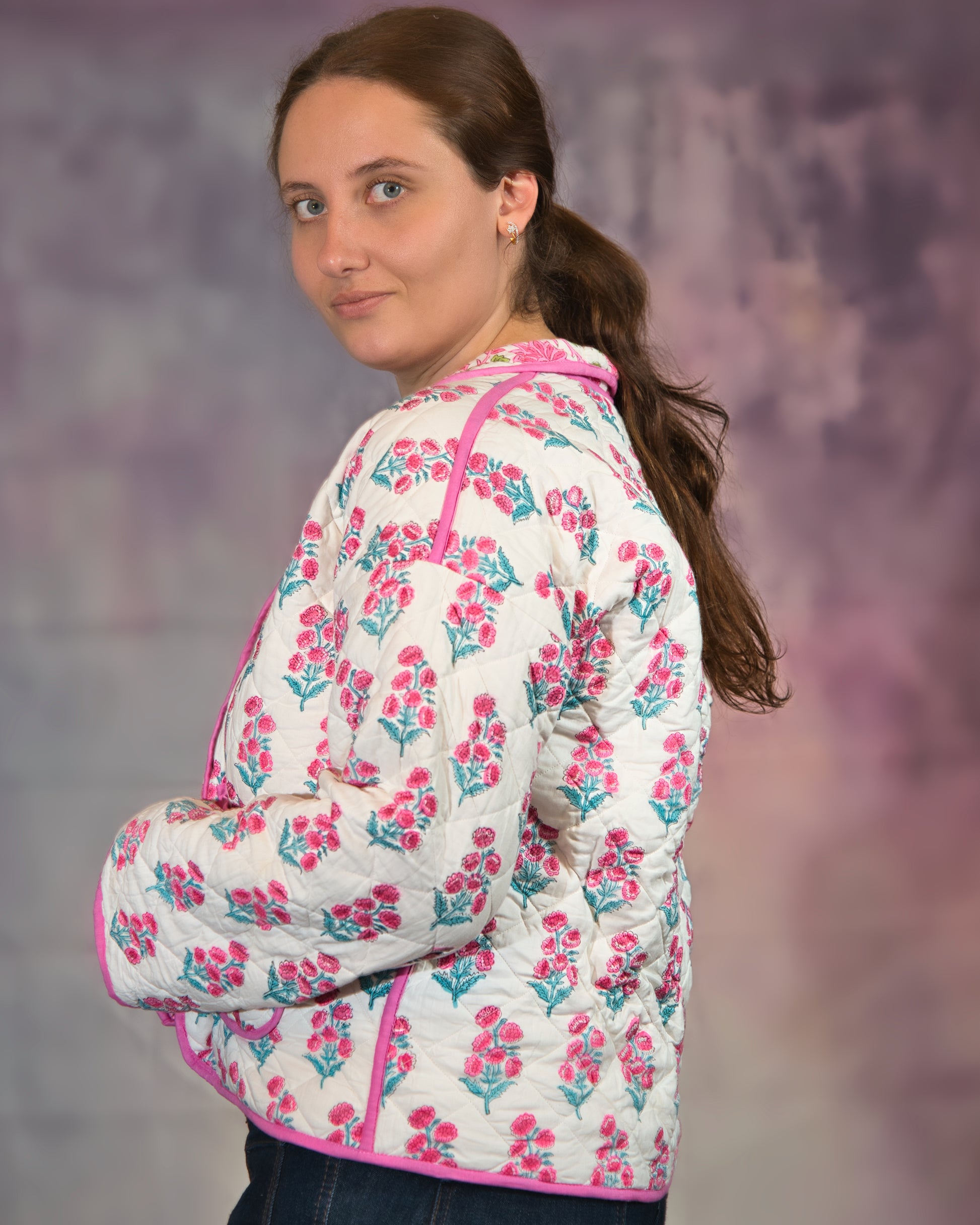 Handcrafted with delicate block prints, this reversible quilted jacket pairs soft pink florals with a fresh white base. Light and versatile, it’s perfect for layering across seasons. Each piece is artisan-made, carrying small variations that add to its unique charm. Best cared for Dry Clean Only.