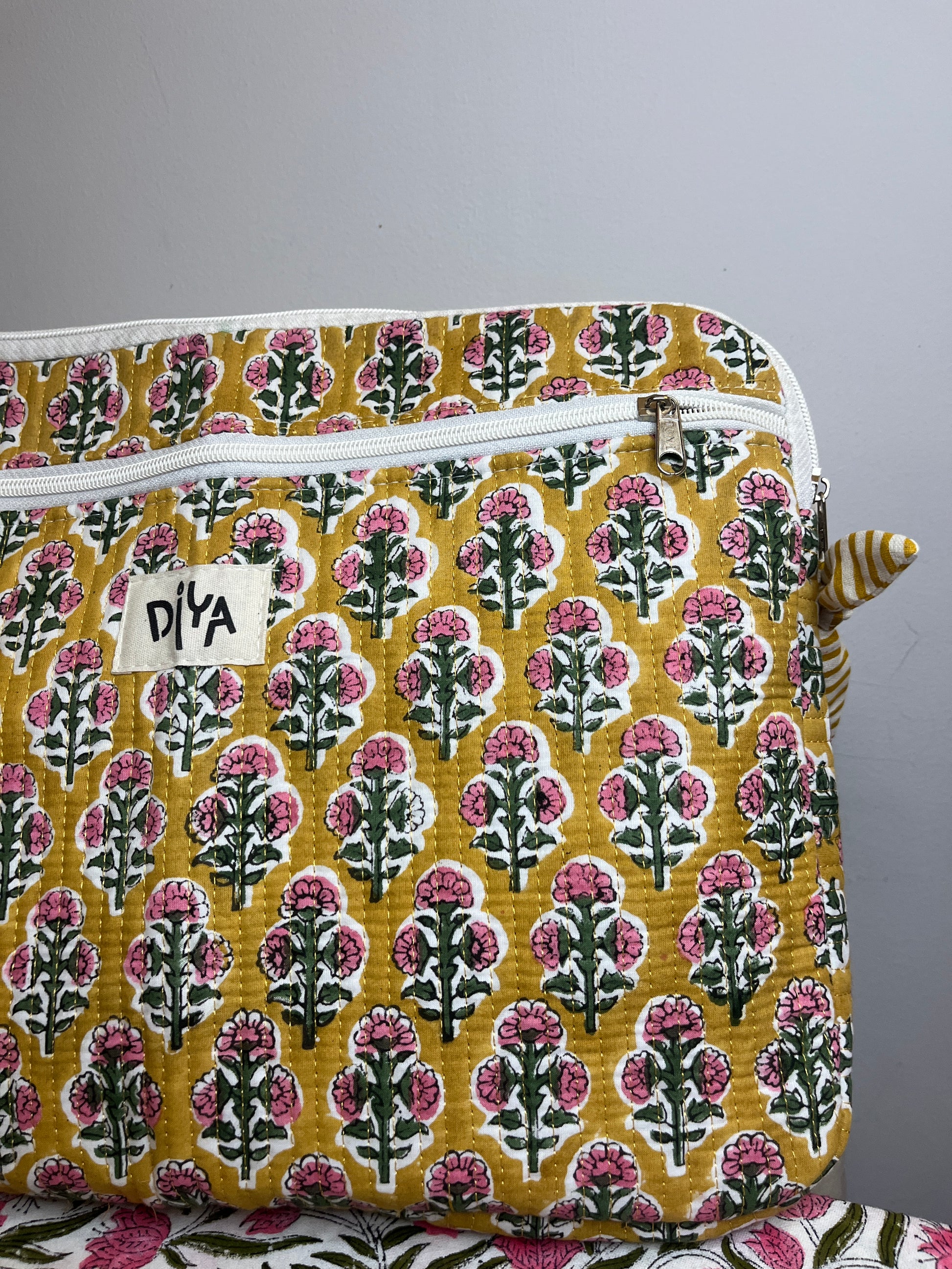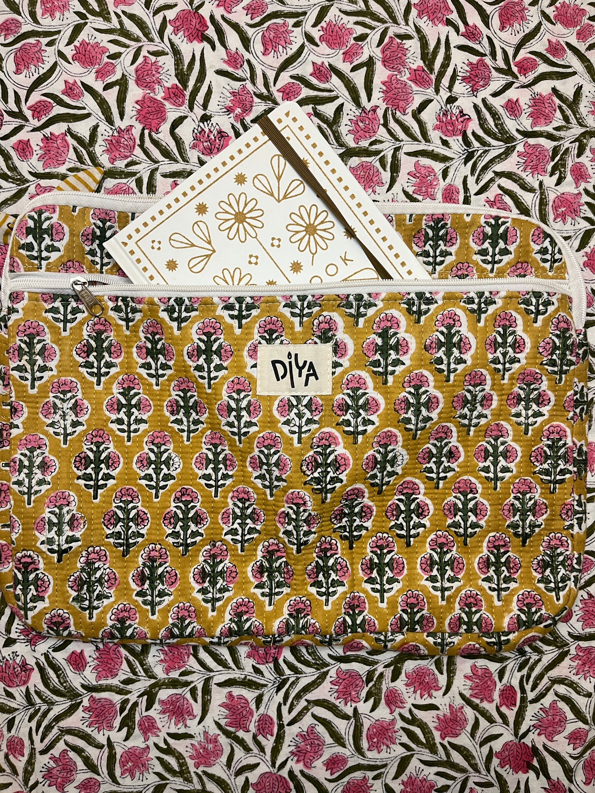 Cheerful pink motifs on hand block-printed cotton. Fits up to an 18-inch laptop and has an extra front pocket for chargers and notes. 100% cotton, hand-printed and easy to style with your day. Hand wash gently in cold water