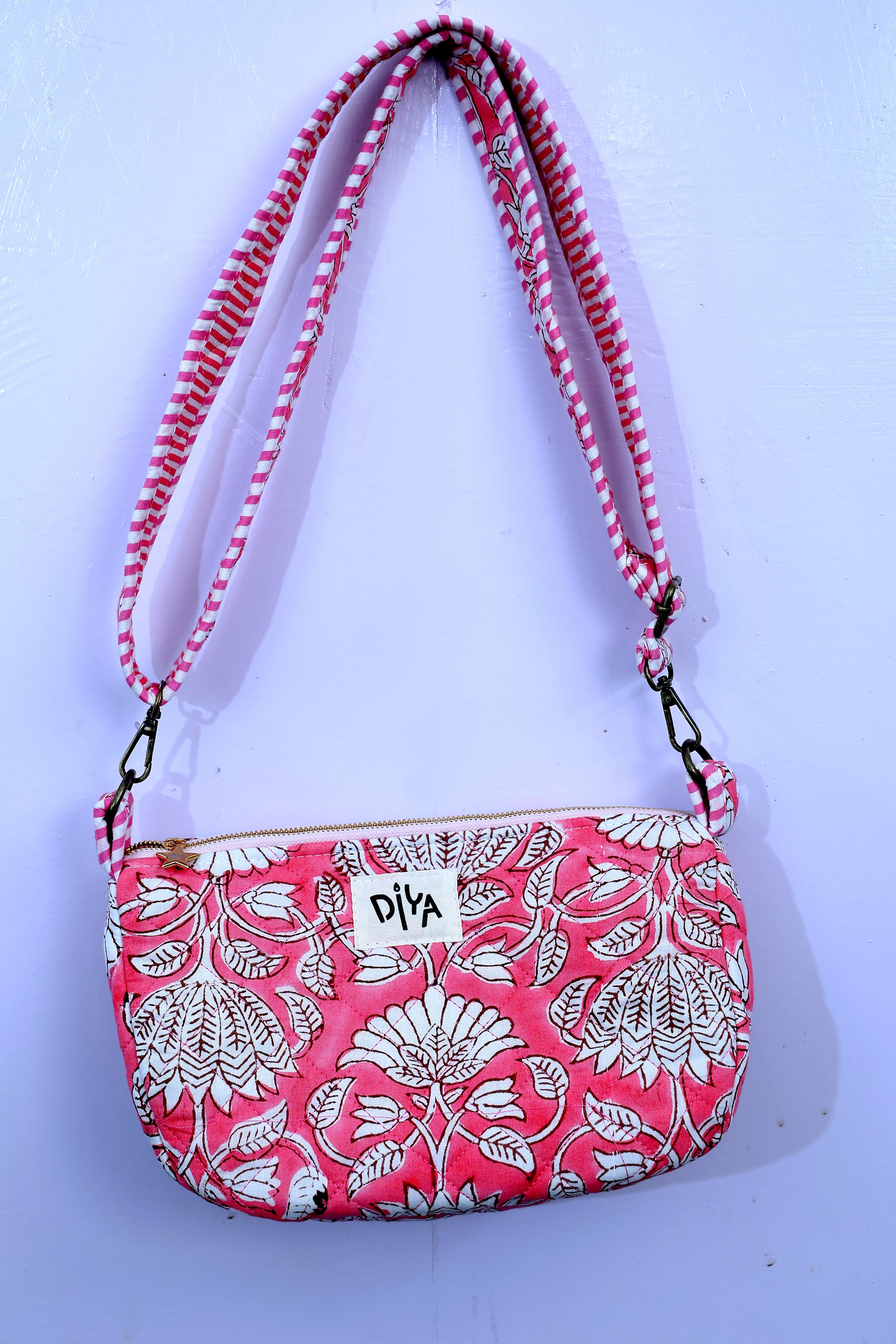 A soft quilt of pink and white block-print cotton, this padded crossbody feels cozy and artisanal. Lightweight and limited-edition, it’s perfect for hands-free days with a charming interior pocket.