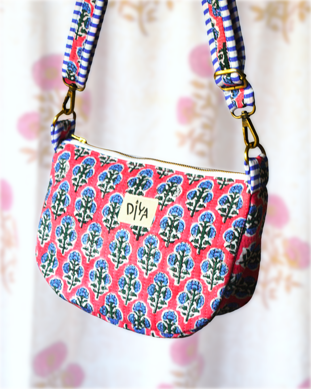 Pretty pink meets cool blue in this floral-print crossbody crafted from quilted cotton, offering a playful and vibrant accessory that’s lightweight, functional, and perfect for everyday wear.
