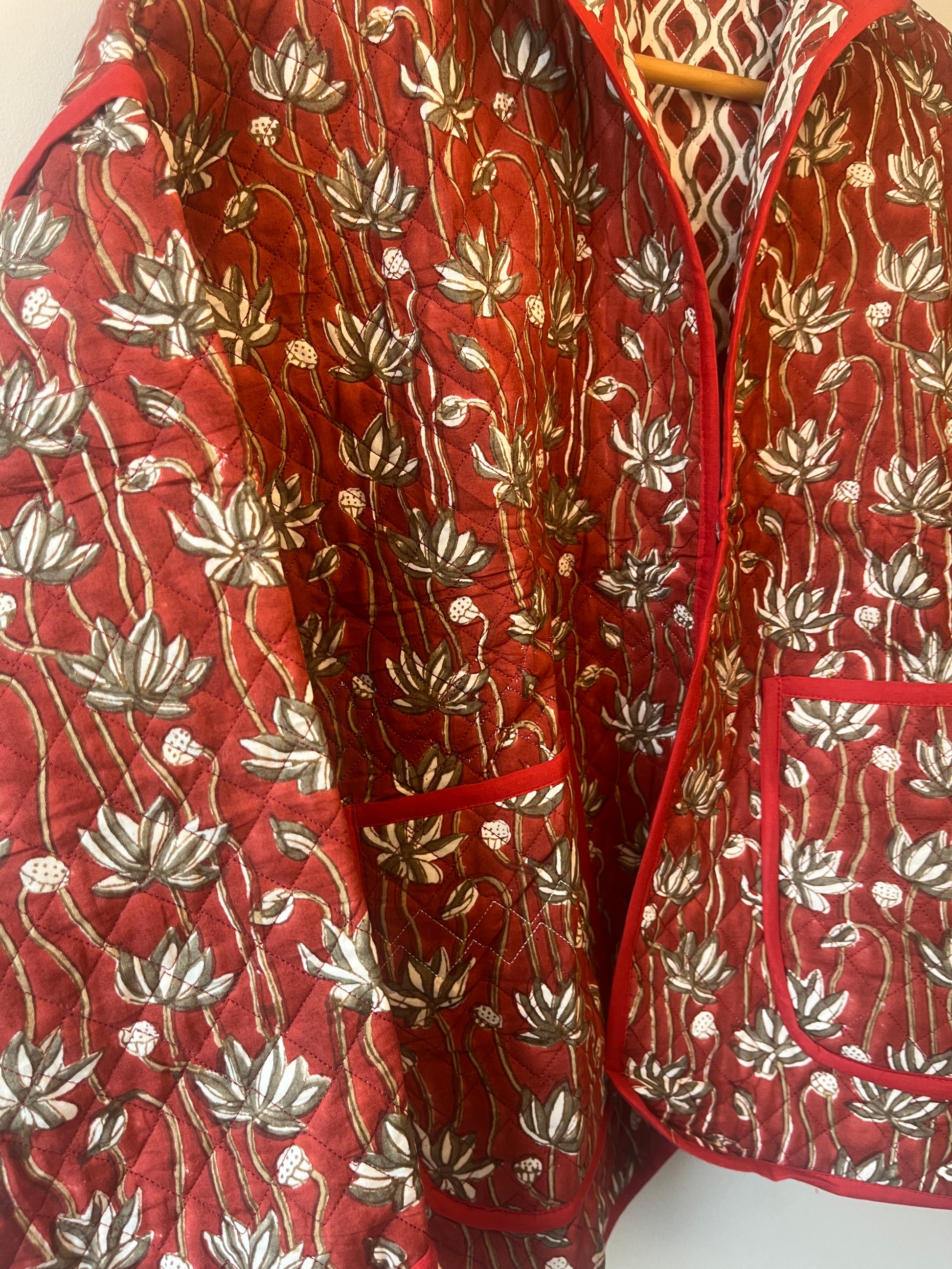One side shows delicate white and grey florals on a warm red base; flip it to reveal a crisp white side patterned with red leaves. Quilted and fully reversible, each jacket carries small, charming variations from artisan block-printing. Care: hand wash in cold water.