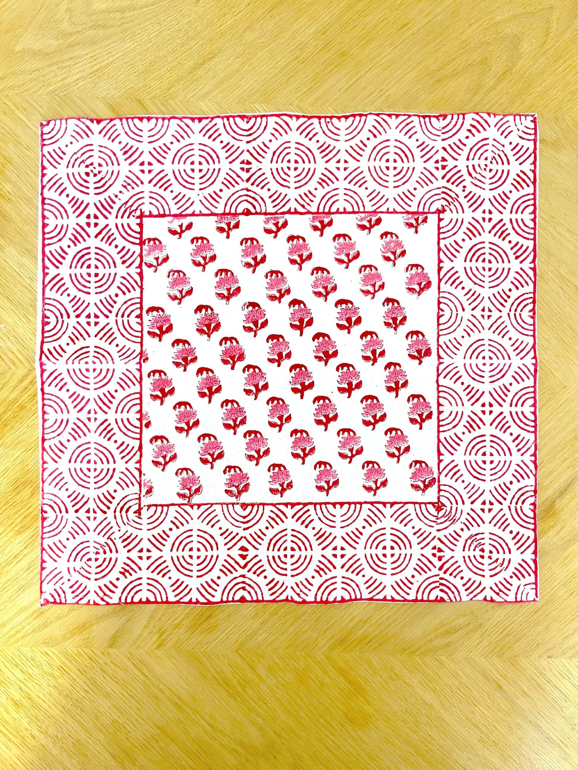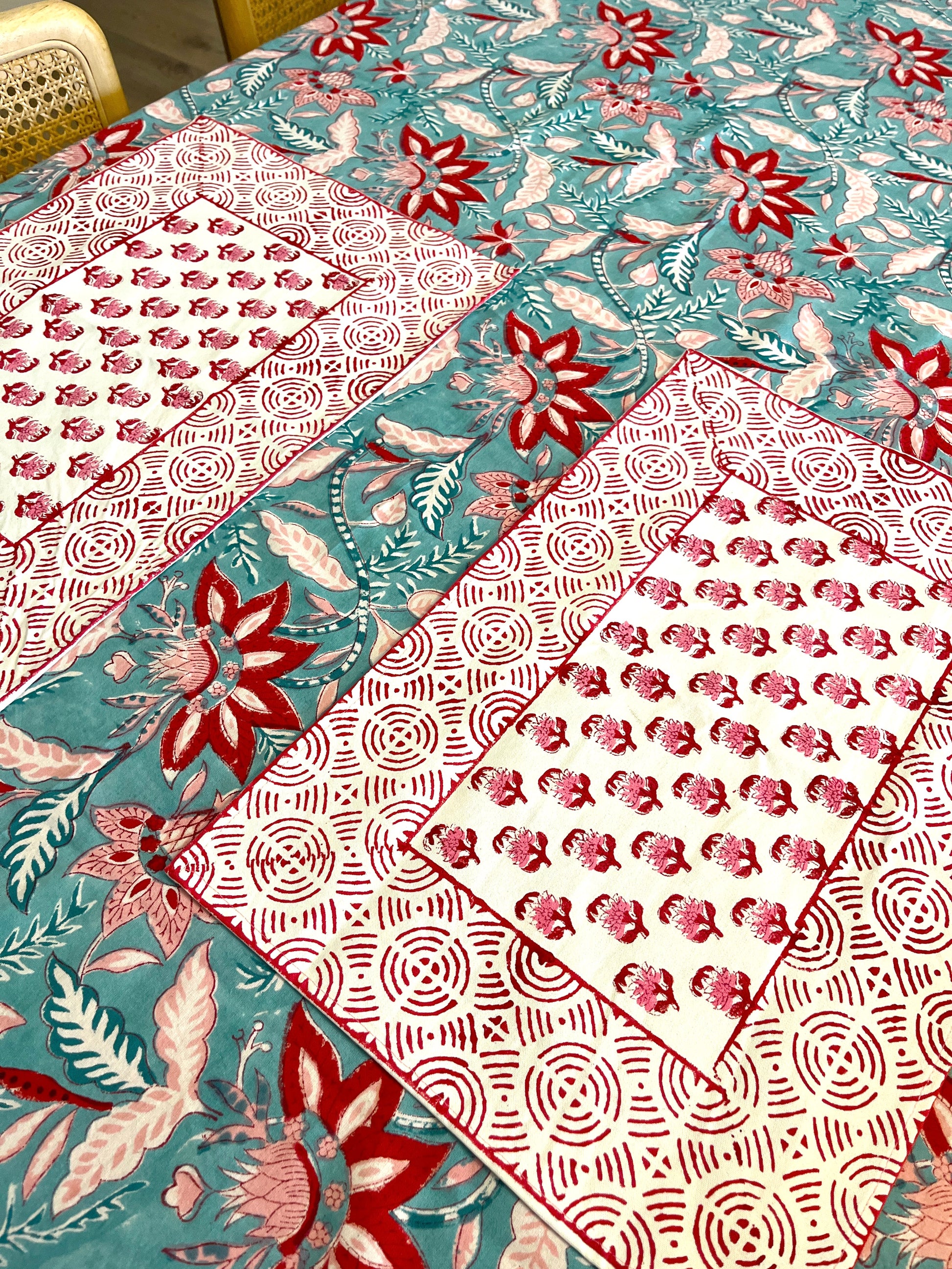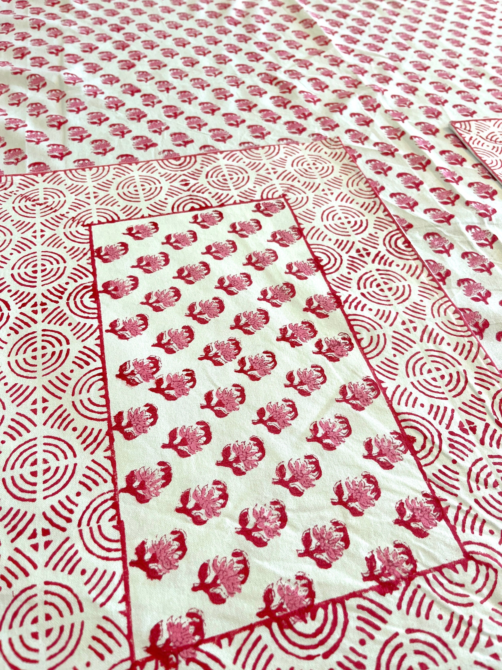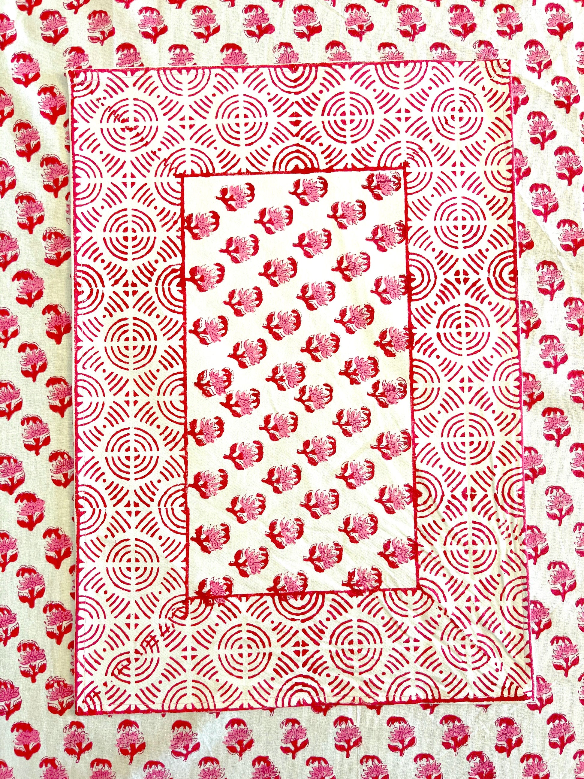 Delicate pink flowers in a fine, detailed pattern. Each placemat is hand block-printed on 100% cotton, 34×48 cm in size. Hand wash gently in cold water.