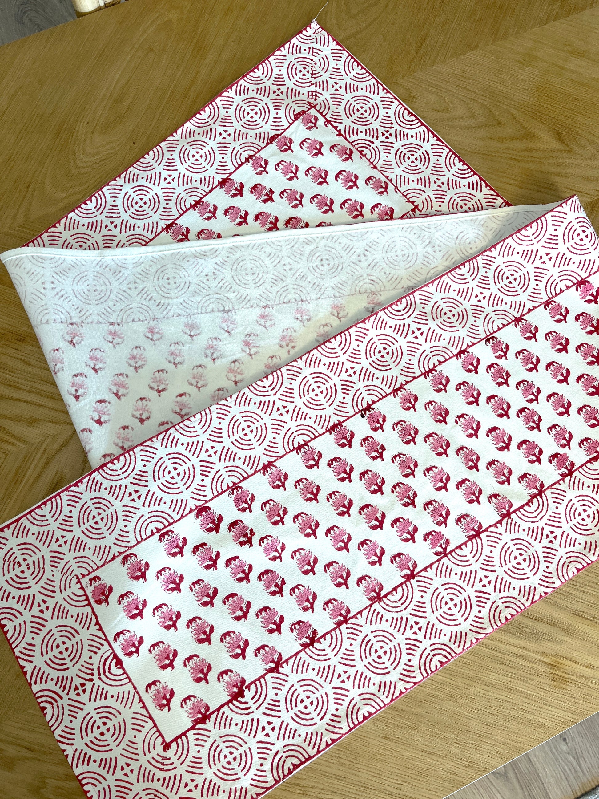 Delicate pink flowers spread gracefully across pure cotton. Hand block-printed, size 33×184 cm. Adds a gentle warmth to any table setting. Wash gently by hand in cold water.