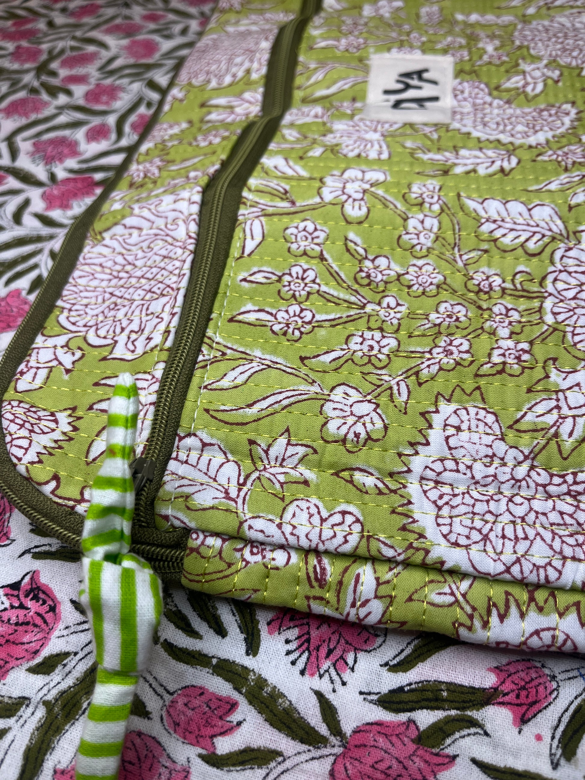 Soft white florals on a light green base — simple, soothing, and functional. Hand block-printed on pure cotton, fits laptops up to 18 inches, with a handy extra pocket for chargers or notes.