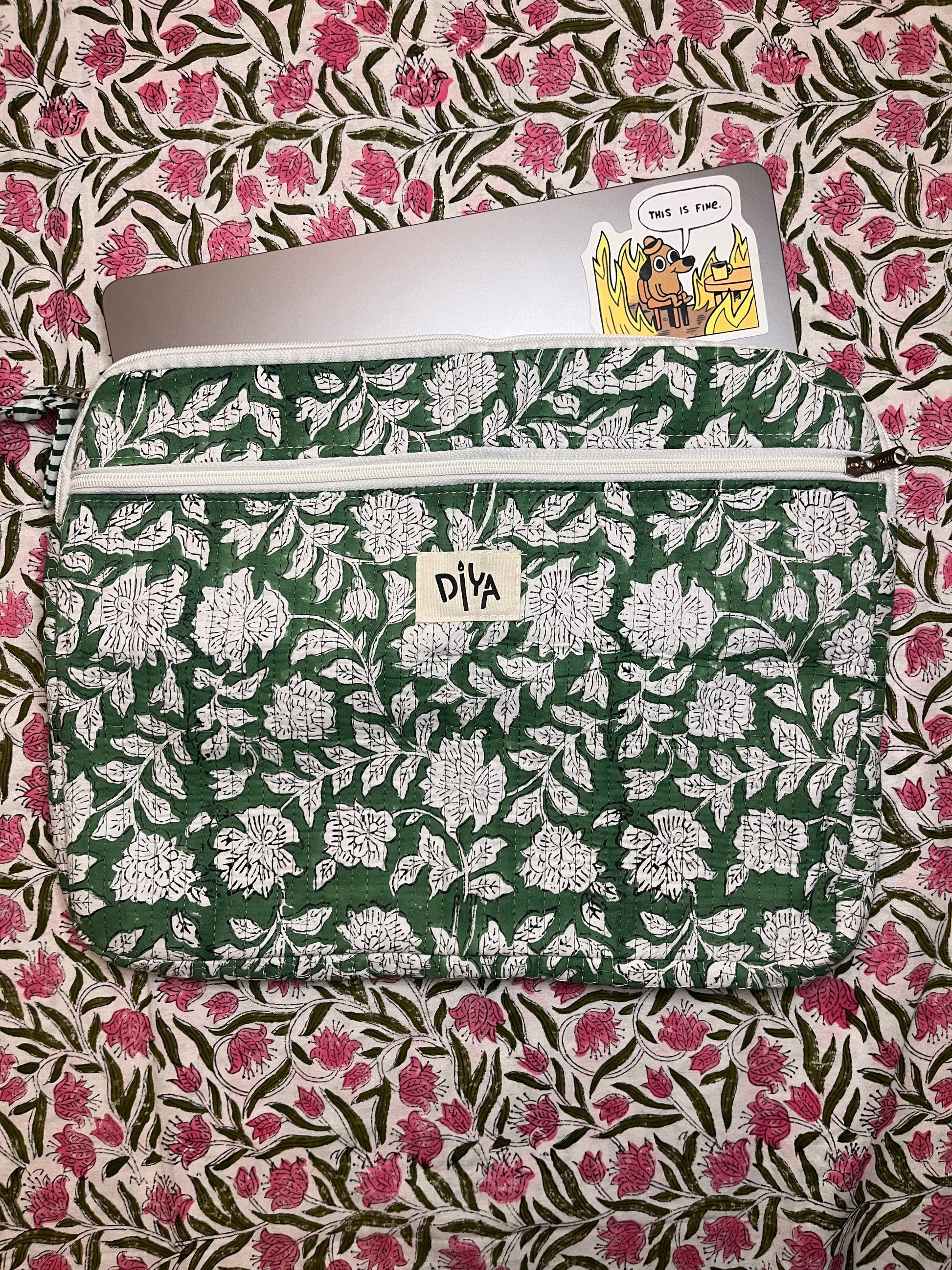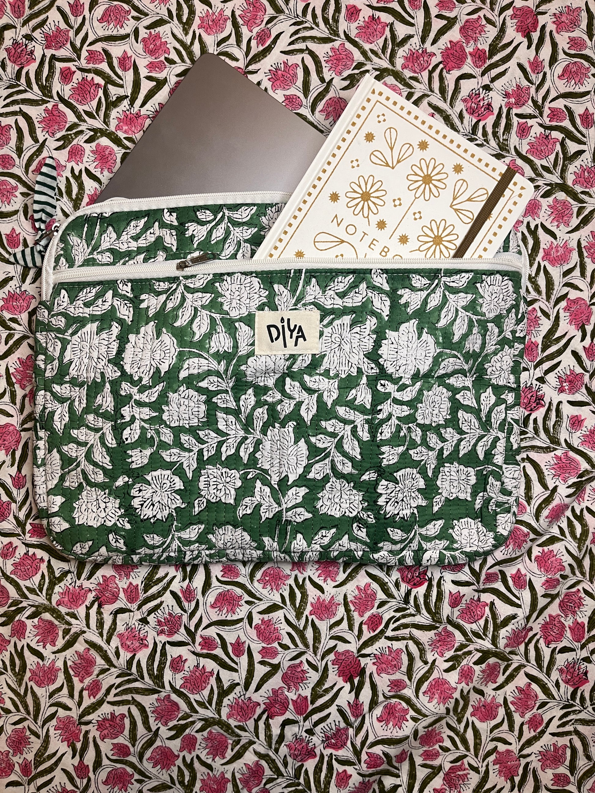 Fresh mint green paired with delicate white florals for a calming touch. Made from 100% block-printed cotton, fits laptops up to 18 inches, and includes an extra pocket for easy storage.
