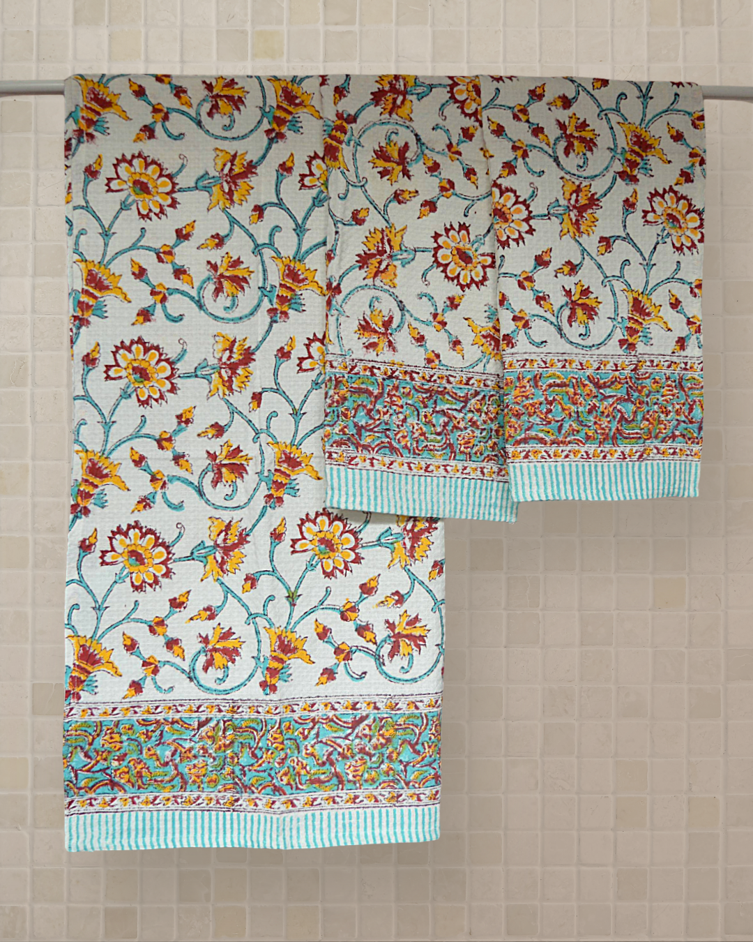 Cheerful yellow florals bring brightness to your towel rack. This set includes one bath towel and two hand towels, all made from hand-printed cotton with a soft, absorbent feel — perfect for everyday comfort.