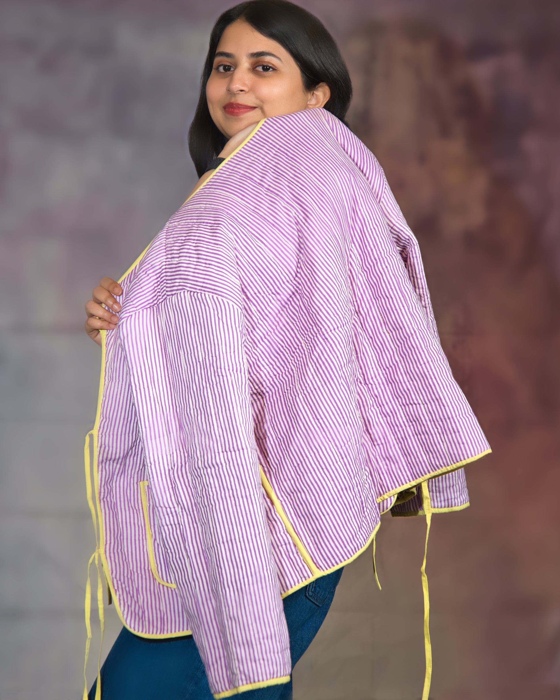 A vibrant reversible jacket featuring bright yellow on one side and purple stripes on the other. Two looks in one, crafted with traditional quilting. Our adjustable ribbon-tie design allows each jacket to comfortably fit across sizes — S–M, L–XL, and 2XL — offering an easy, flexible fit for different body shapes. Dry-clean only.